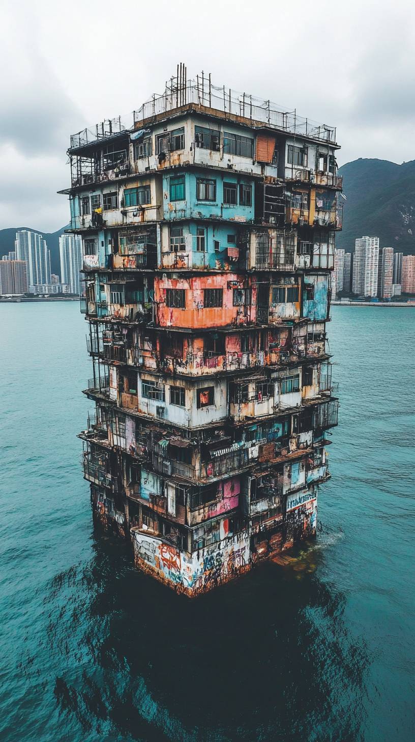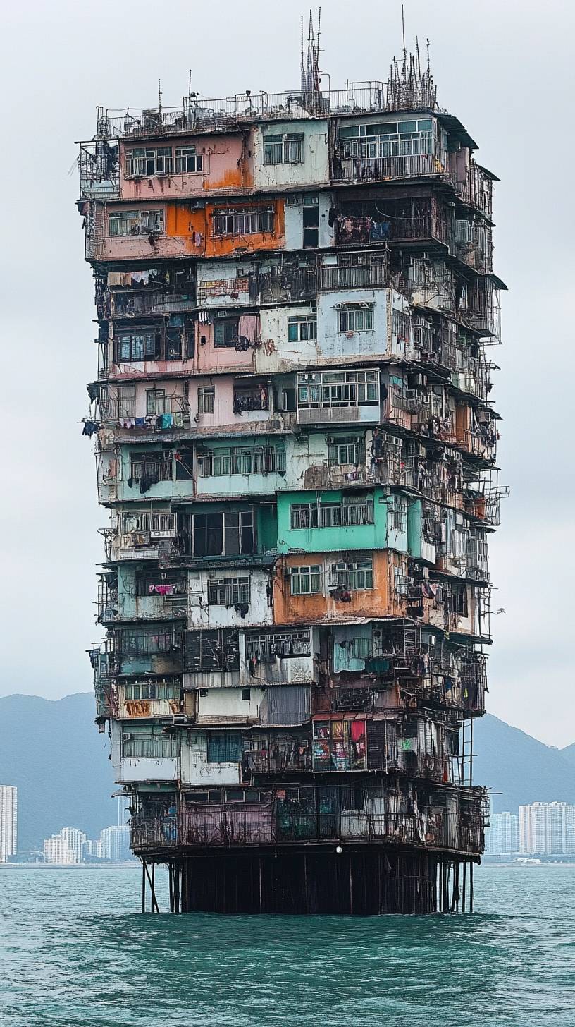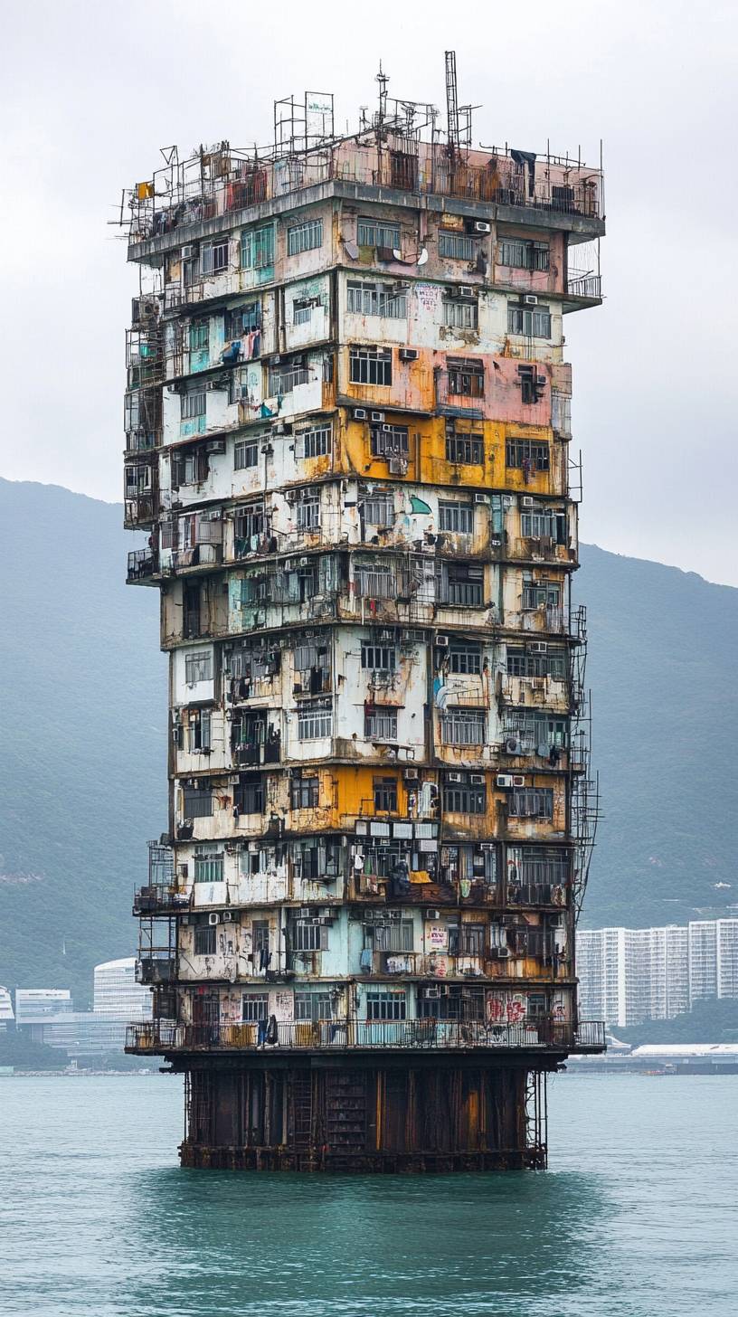 Only one illegal Kowloon Castle-style skyscraper floats in the middle of the sea. The top floor is obscured by black. The entire balcony is covered with iron bars, slums, graffiti.