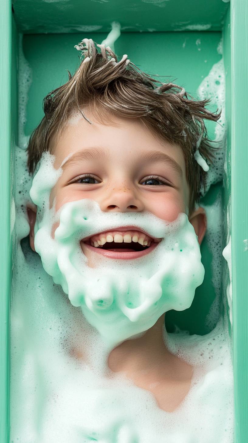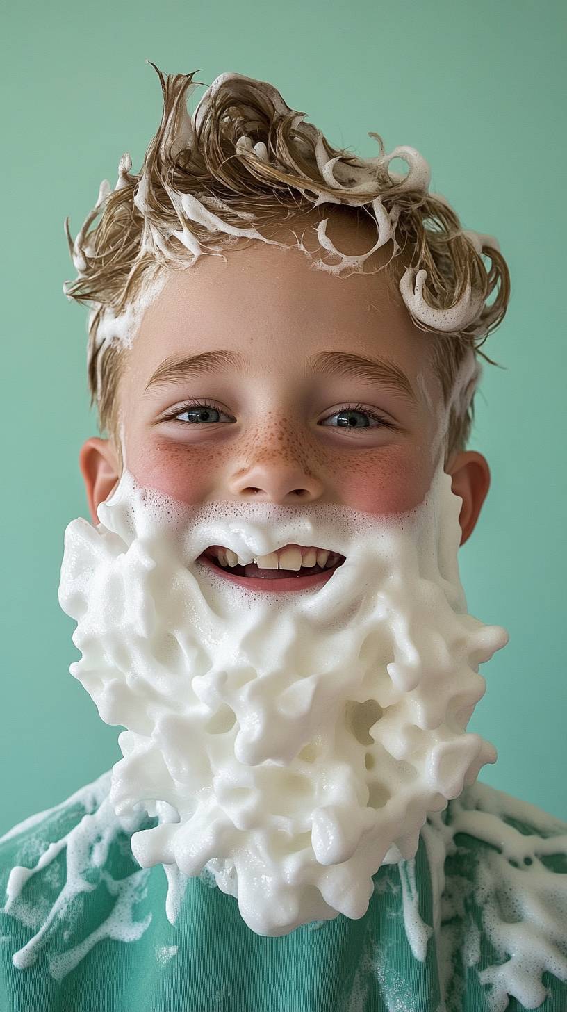 Photo portrait of cheerful boy with foam beard, in barber shop, Wes Anderson style, white light green shades, studio color, high detail. --chaos 10 --ar 9:16 --personalize 8gnwp6s --v 6.1