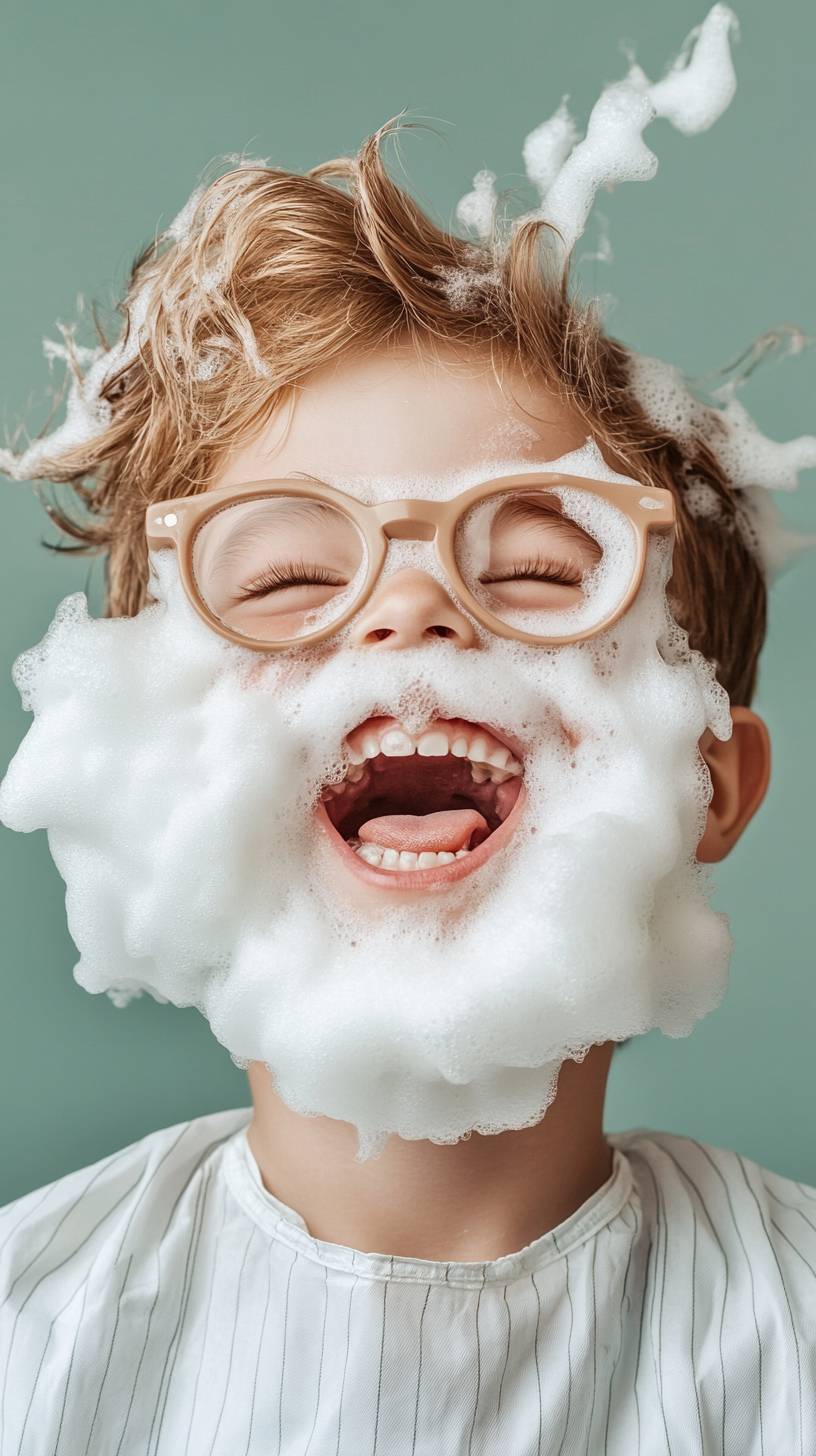 A photo portrait of a cheerful boy with a foam beard, in a barber shop, Wes Anderson style, white light, green shades, studio color, high detail.