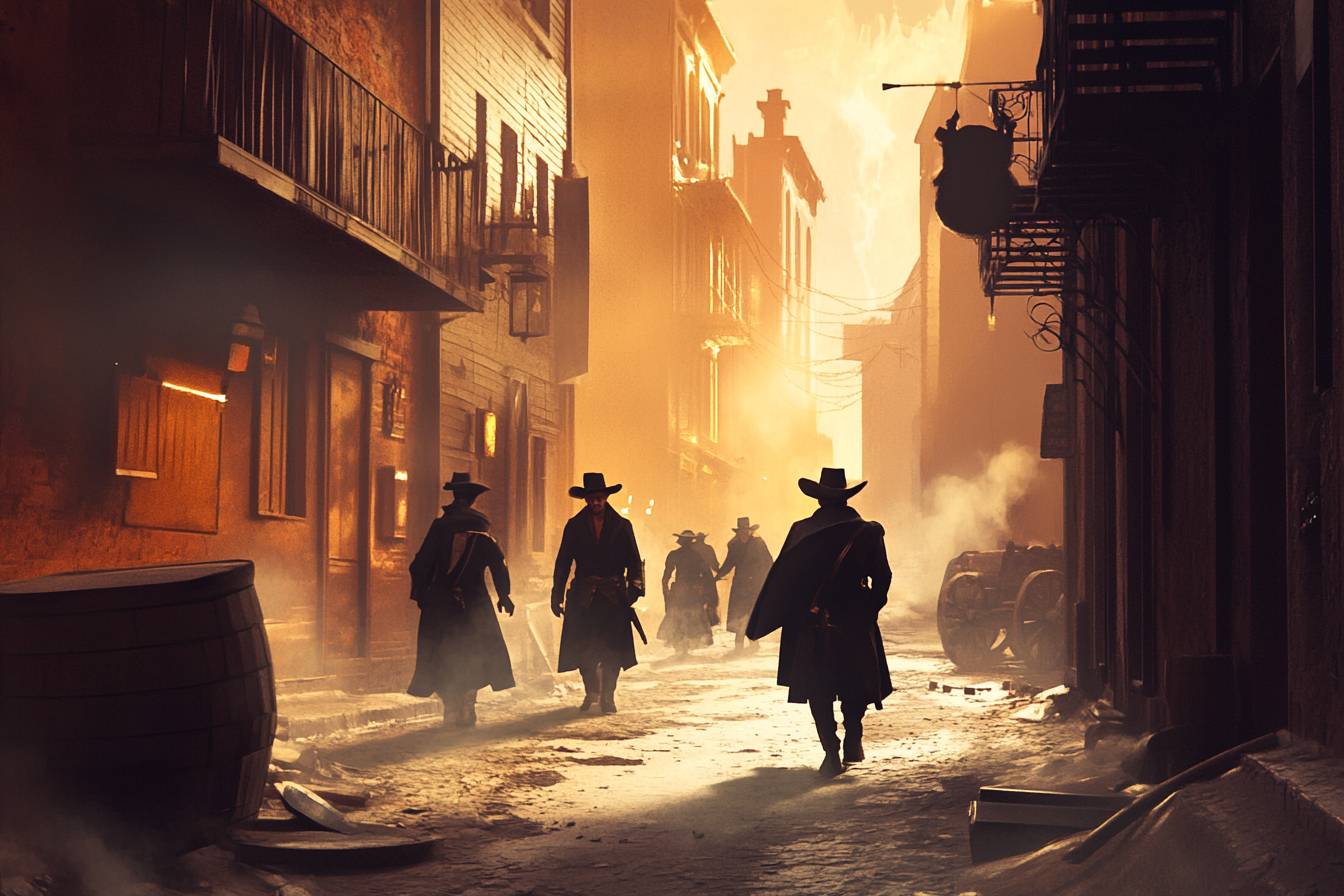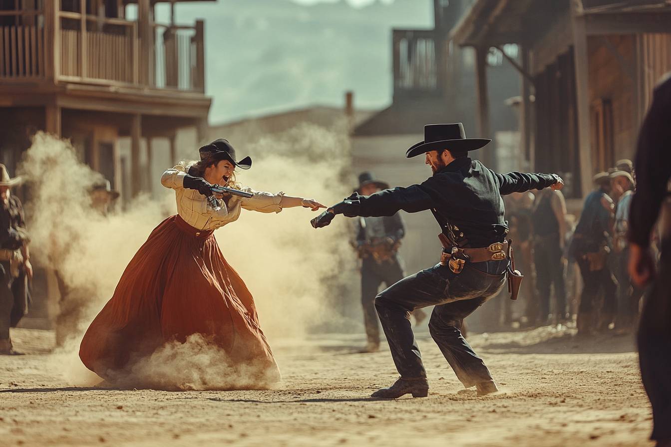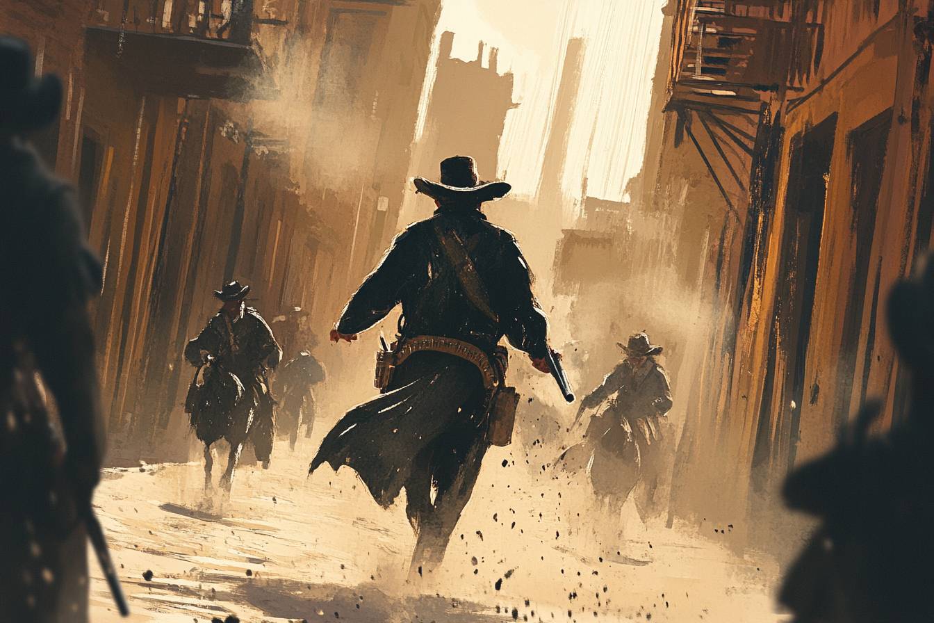 The scene is set in a Wild West showdown, with dusty streets and intense duels. Use warm colors to capture the rugged and adventurous spirit of the Old West.