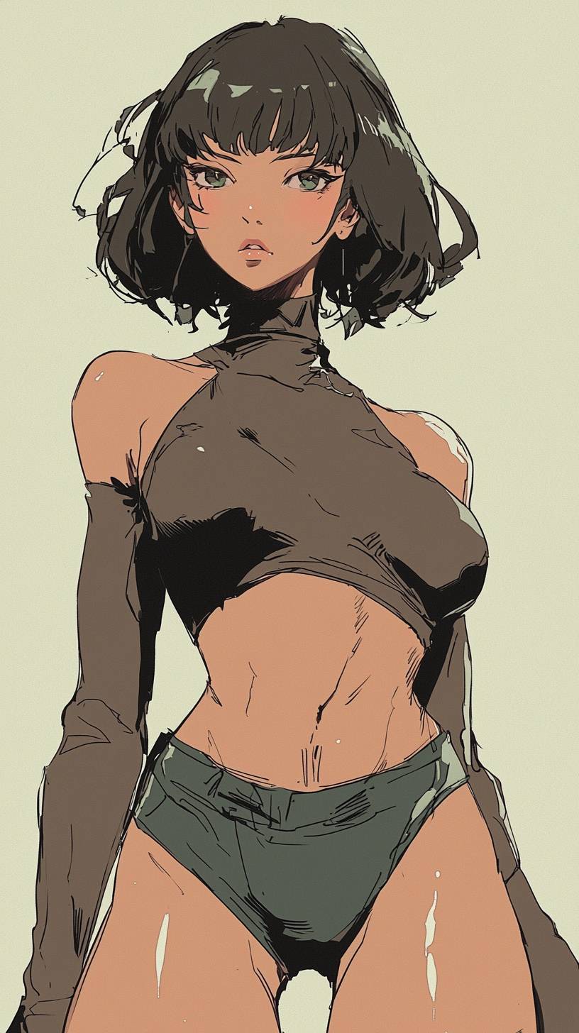 A young woman wearing a sleek, form-fitting turtleneck that complements her figure, styled with a pencil skirt for an elegant outfit, high definition, clean lines, color atmosphere, masterpiece, flat color, anime core