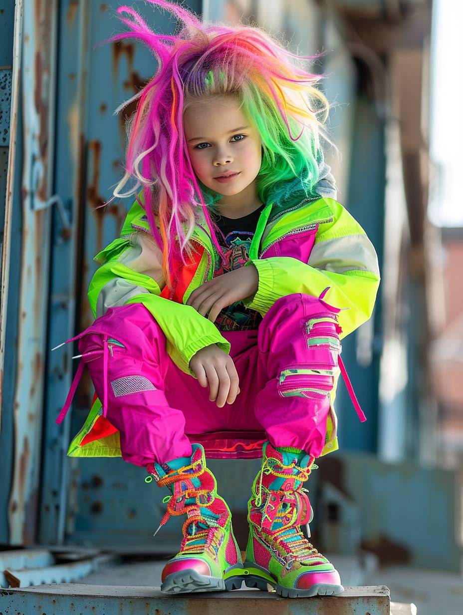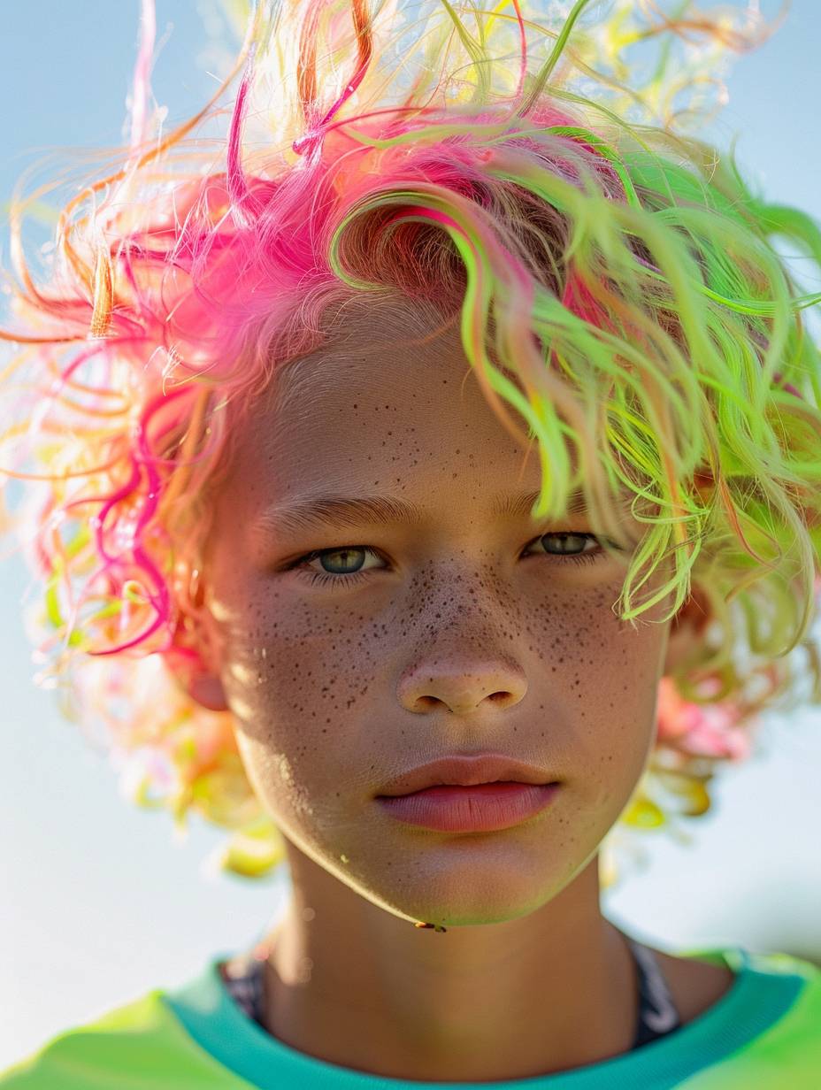 realistic photo: a 10-year-old white boy in fun outdoor scene. Neon pink and neon green high fashion colors clothes and colored hair. --ar 3:4 --style raw --stylize 200 --v 6.0