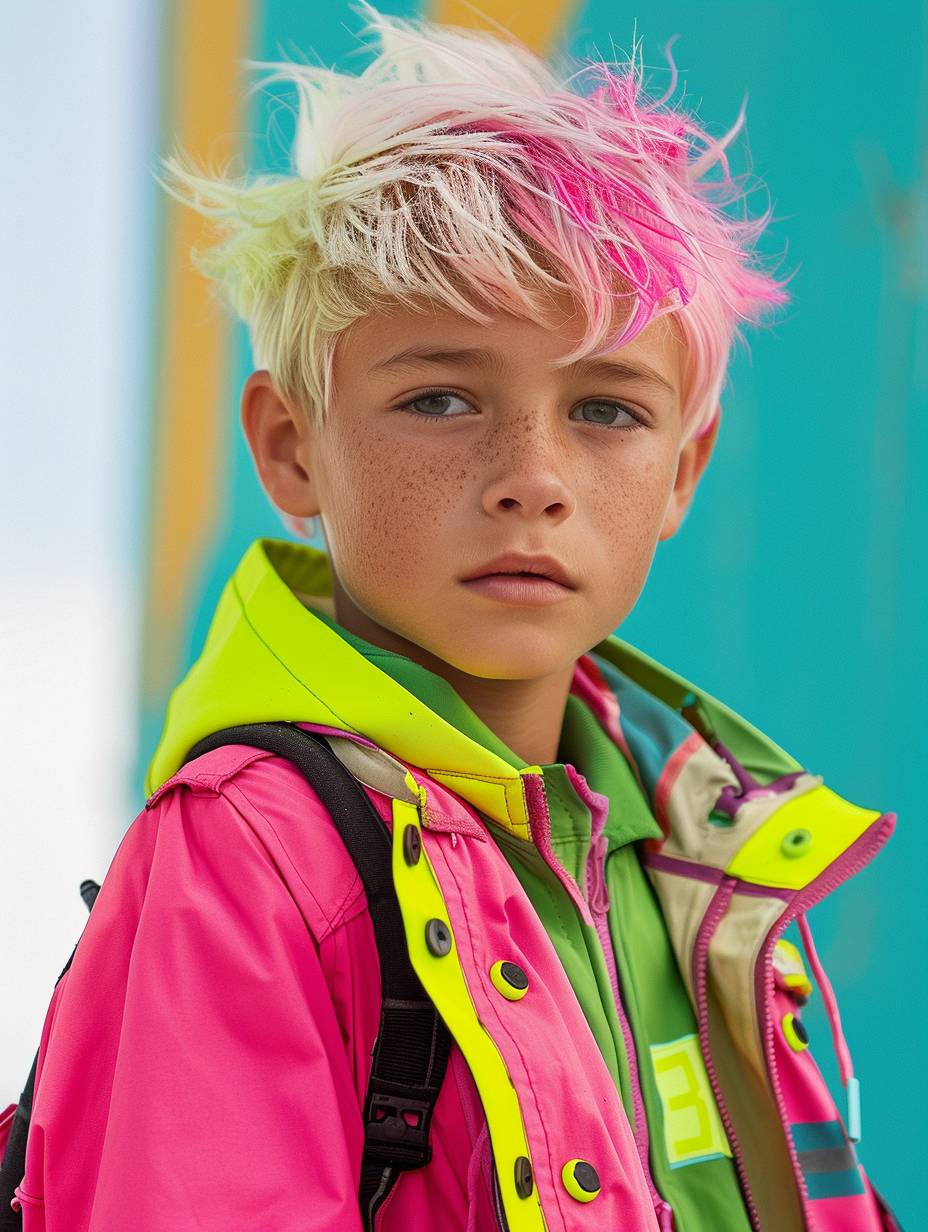 A 10-year-old white boy in a fun outdoor scene, wearing neon pink and neon green high fashion clothes and colored hair.