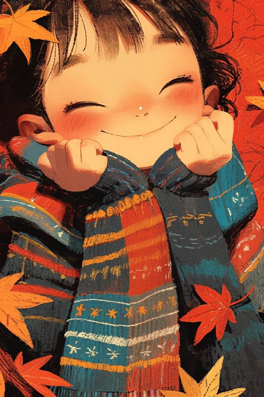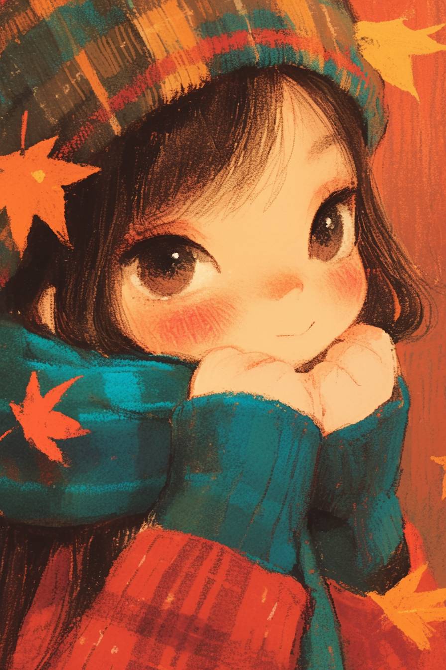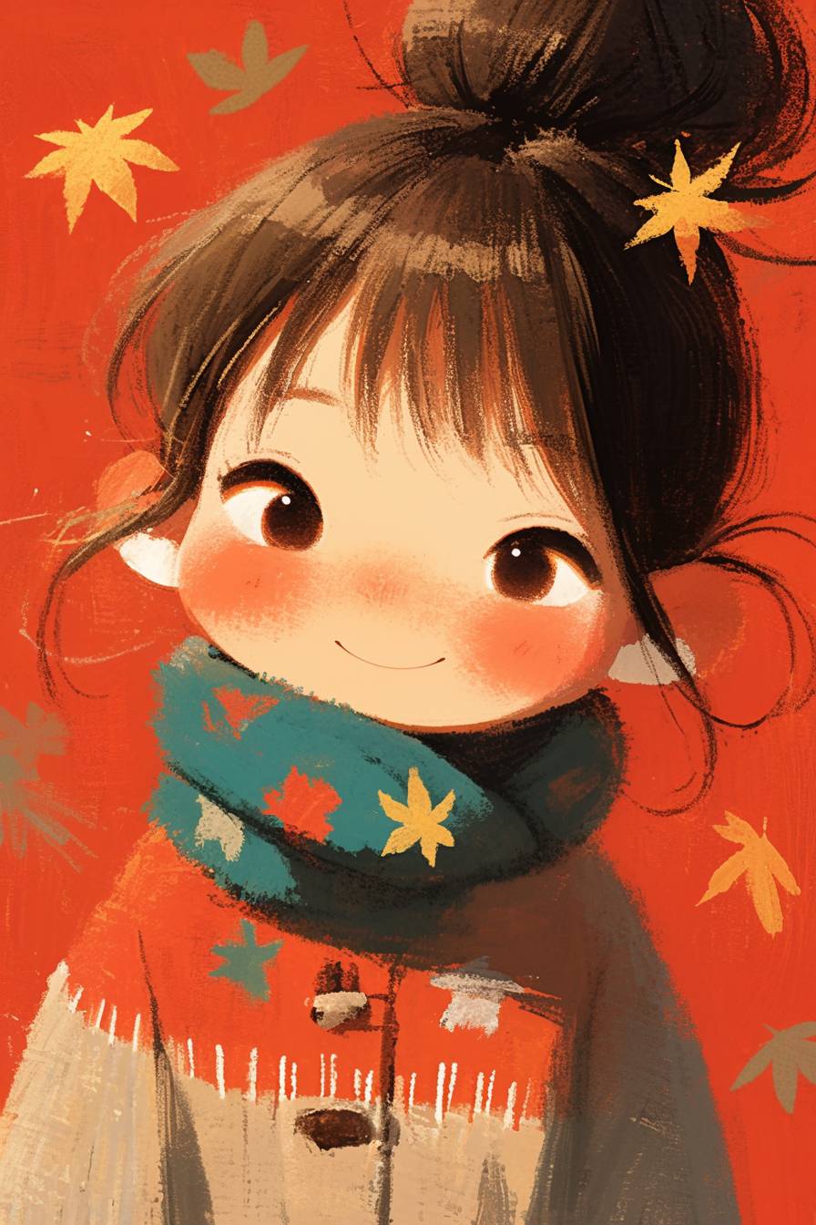 Close-up: A cute little girl is smiling and sitting against a Chinese red wall, wearing warm autumn clothes and holding a marker in her hand. The little girl is looking at the camera and drawing, with maple leaves flying in the autumn sky. The background is colorful and simple. It features warm tones and soft brushstrokes. There should be other elements around her, such as leaves falling from the trees, to add depth. This design creates a peaceful atmosphere, a scene suitable for painting. --ar 85:128 --stylize 1000 --niji 6