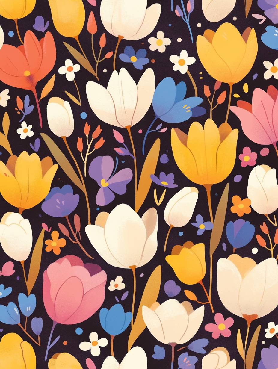 A pattern of colorful tulips in full bloom, with vibrant colors against a dark background. The flowers have detailed petals and leaves, creating an elegant floral arrangement that captures the beauty. This design would be suitable for a fabric print. --ar 3:4 --stylize 750 --niji 6