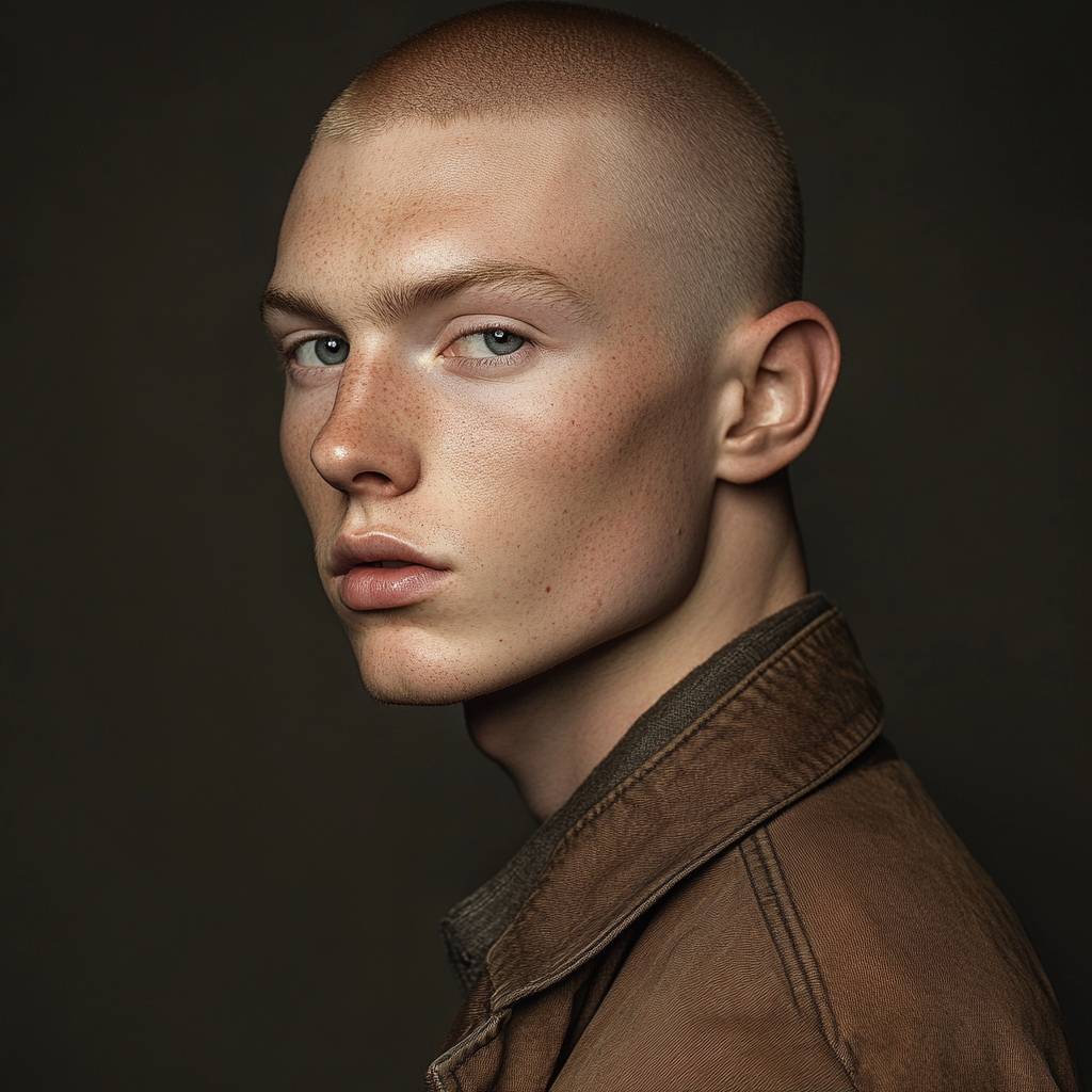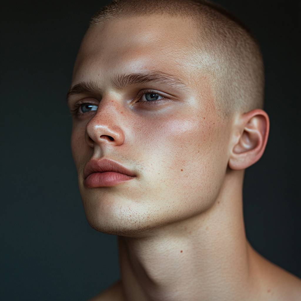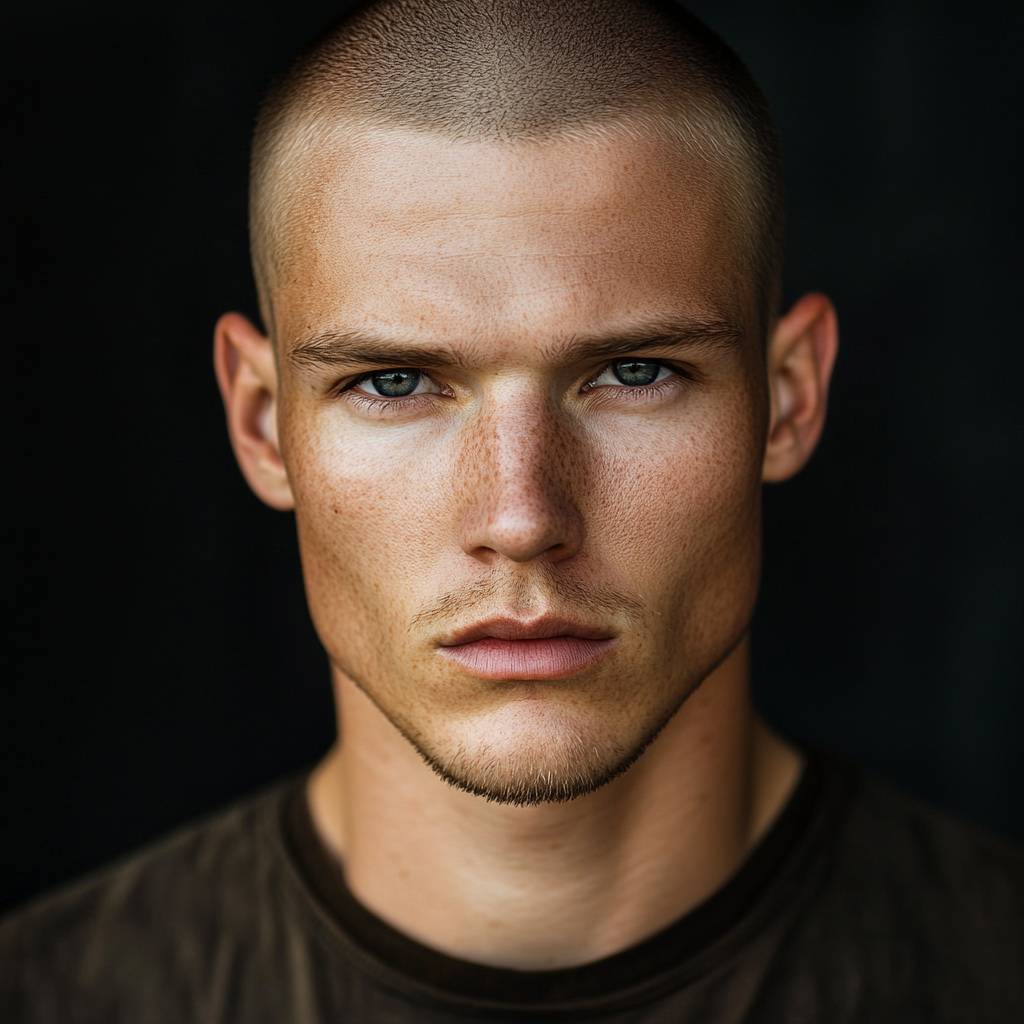 men with a very short (almost bald) dirty dark blond hair, model portrait photo --v 6.1