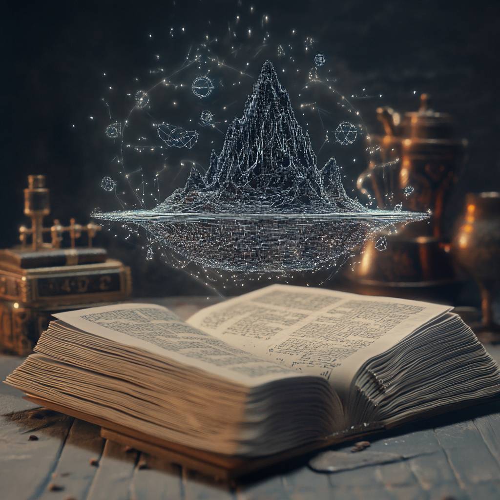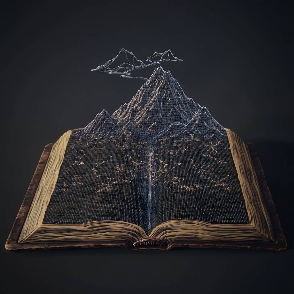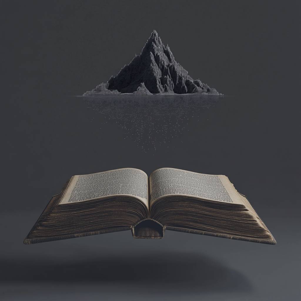 Splayed open flat alchemist book, pages are laid flat, a pixelated 3d outline of the Monte Antelao hovers above it, background is a featureless dark gray, photorealistic, 8k --stylize 50 --v 6.1