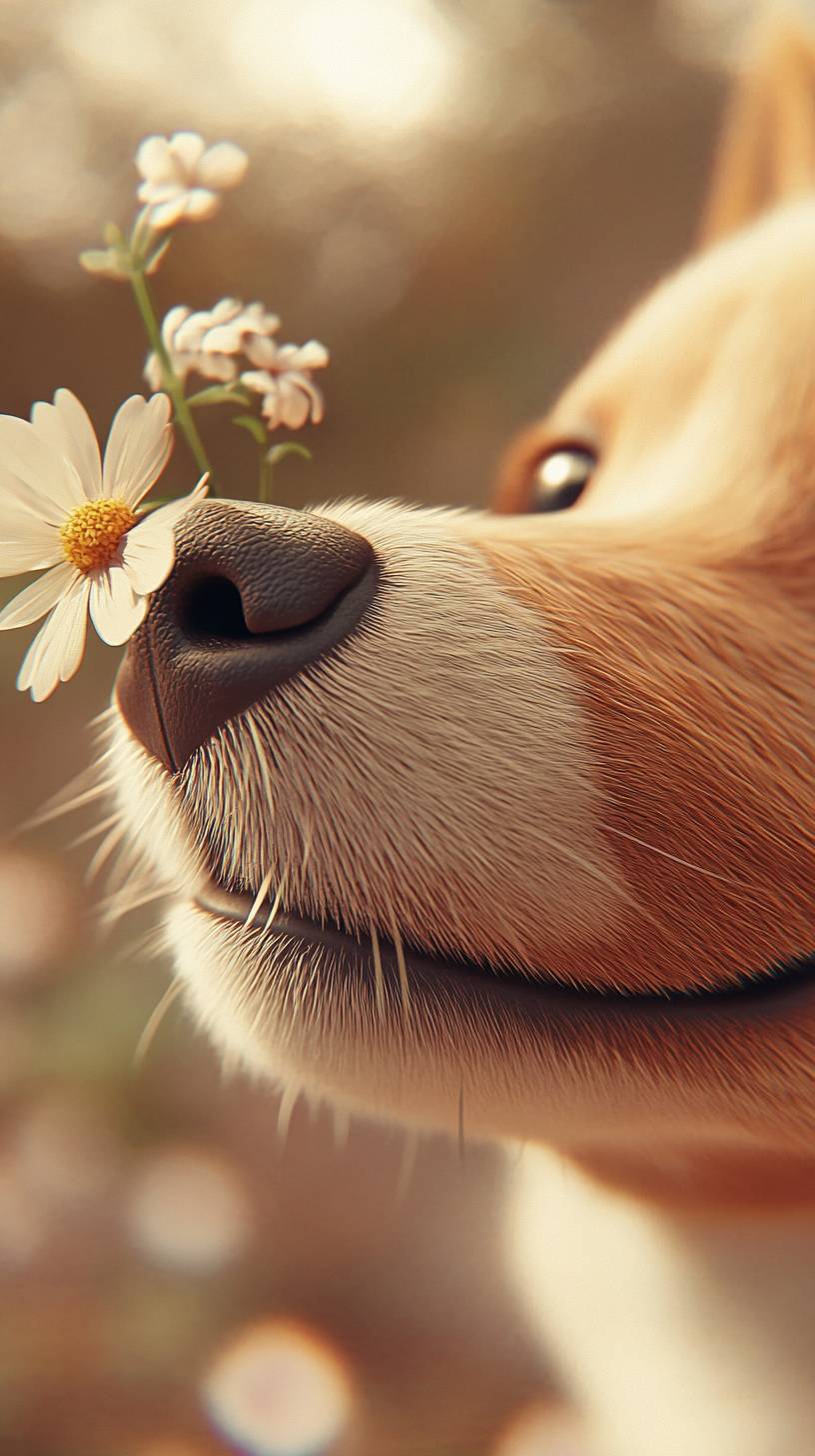 a cute closeup of a dog nose with a flower growing from it, expressive eyes, studio plain light background, pixar style, disney style, --ar 9:16 --v 6.1