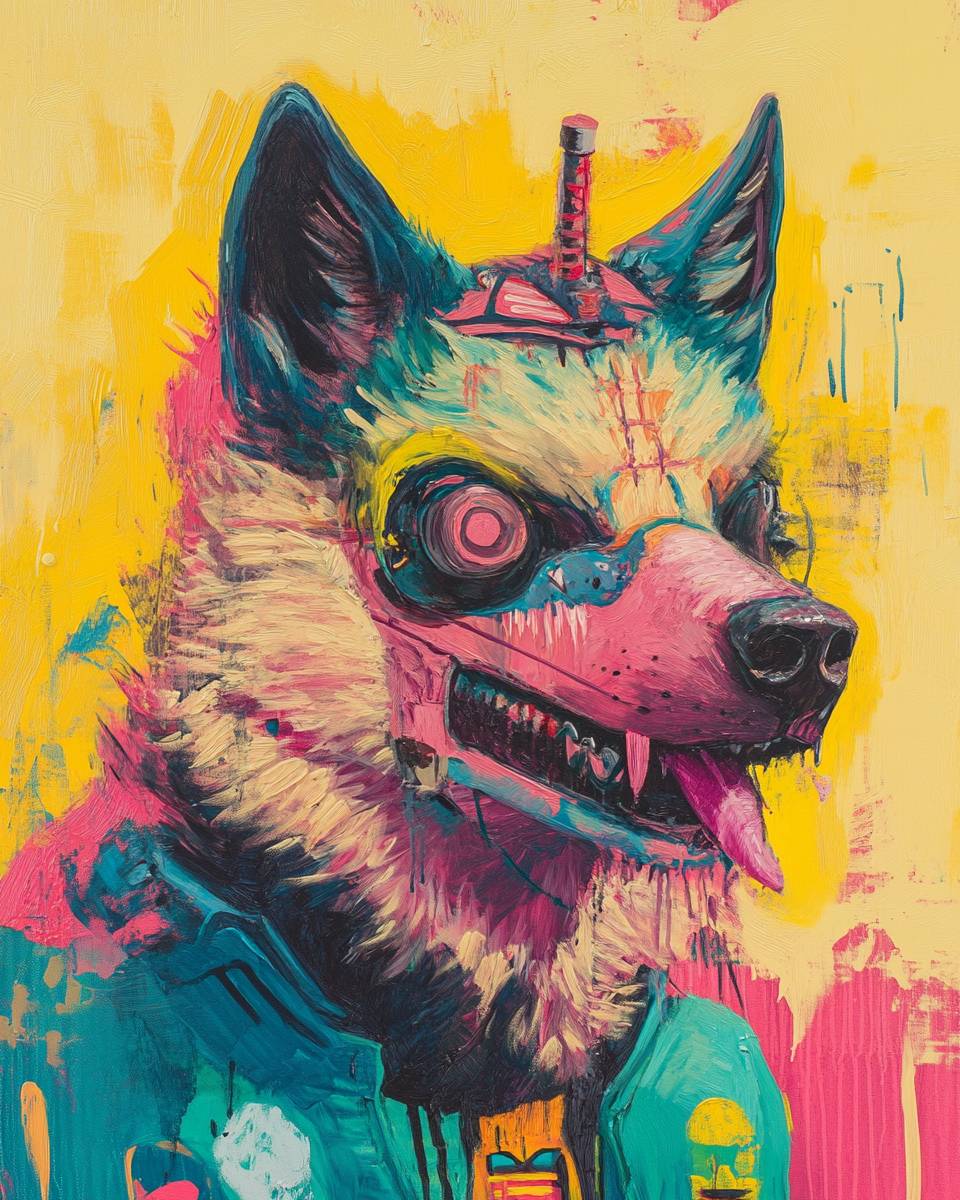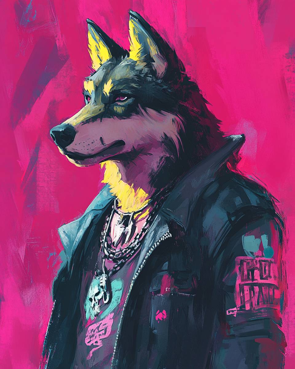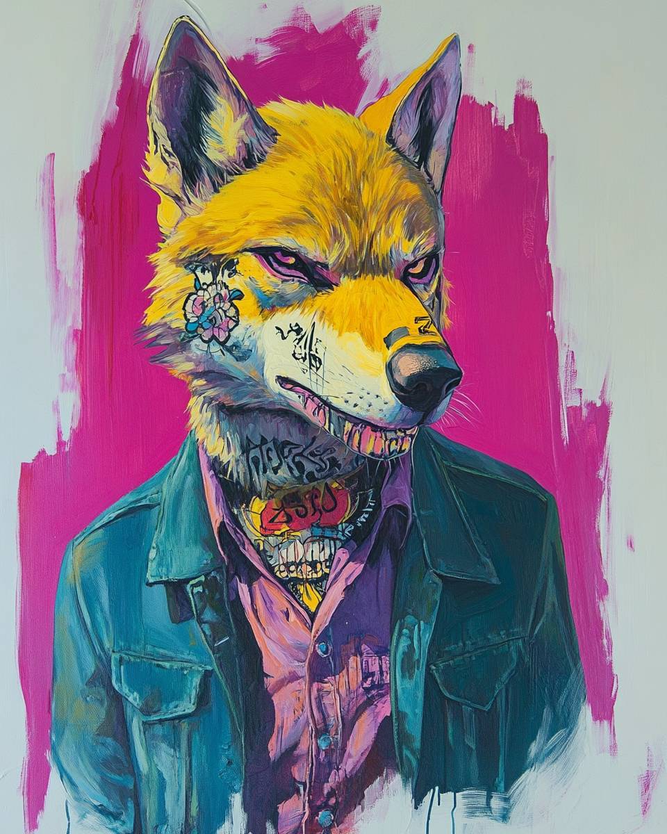 Tattooed wolf in light yellow and magenta, representing neo-punk rebellion.