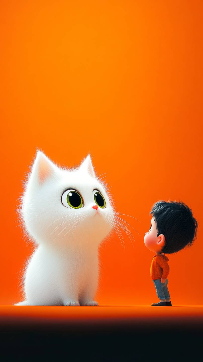 A cute white cat with big eyes looks at an extremely small boy in the style of Pixar, with an orange background and high-definition details. The perspective of the picture is from front to back, and the background color is a solid orange. --ar 9:16 --v 6.1