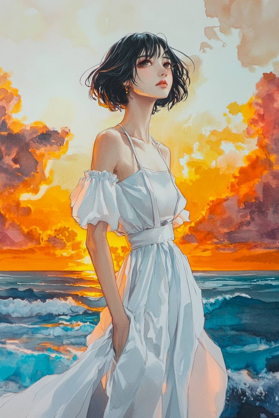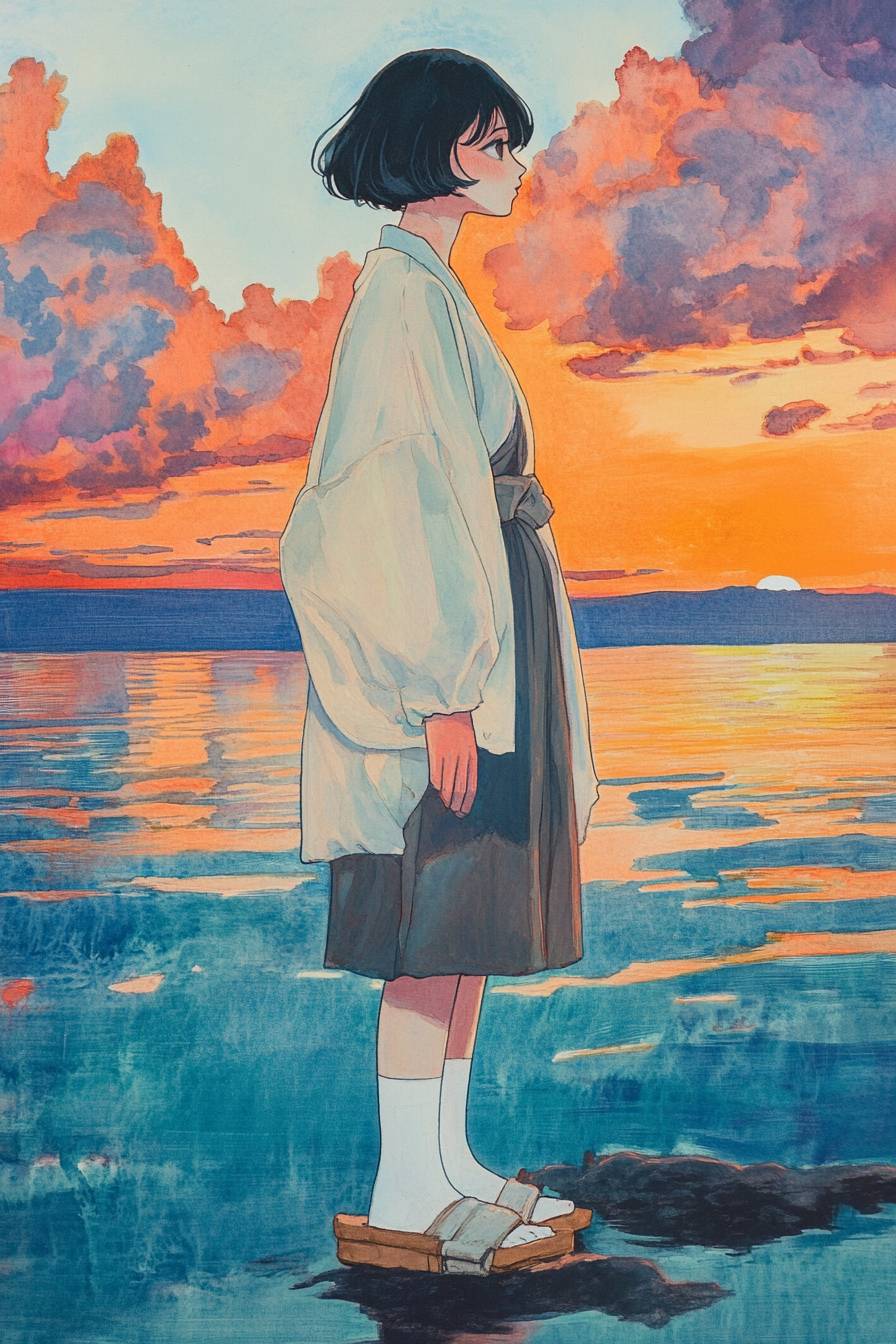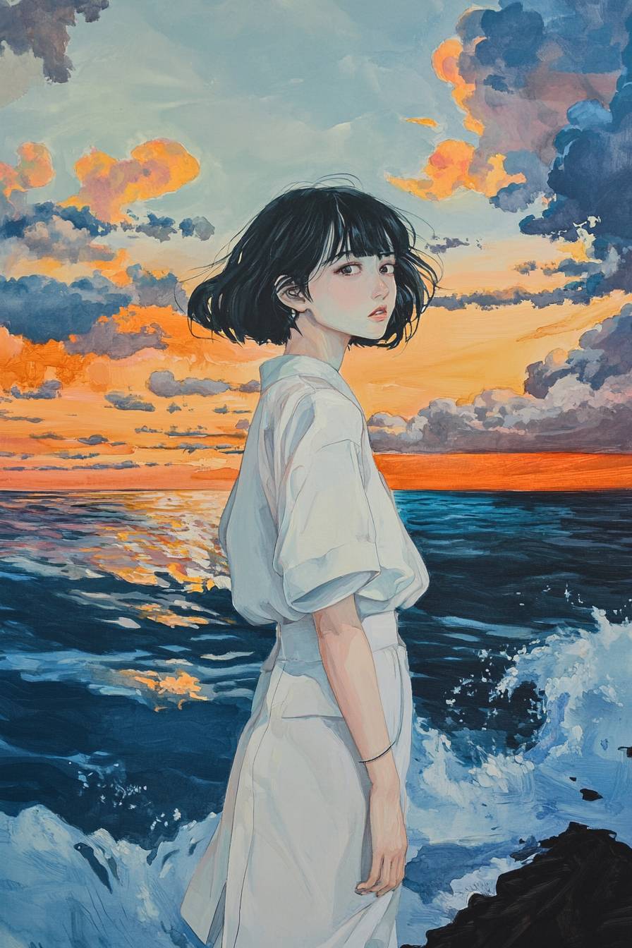 Japanese woman, short black hair and white skin, wearing modern clothes, standing in front of the serene sea with sunset clouds, dynamic pose, full body, manga style gouache painting --ar 2:3 --v 6.1