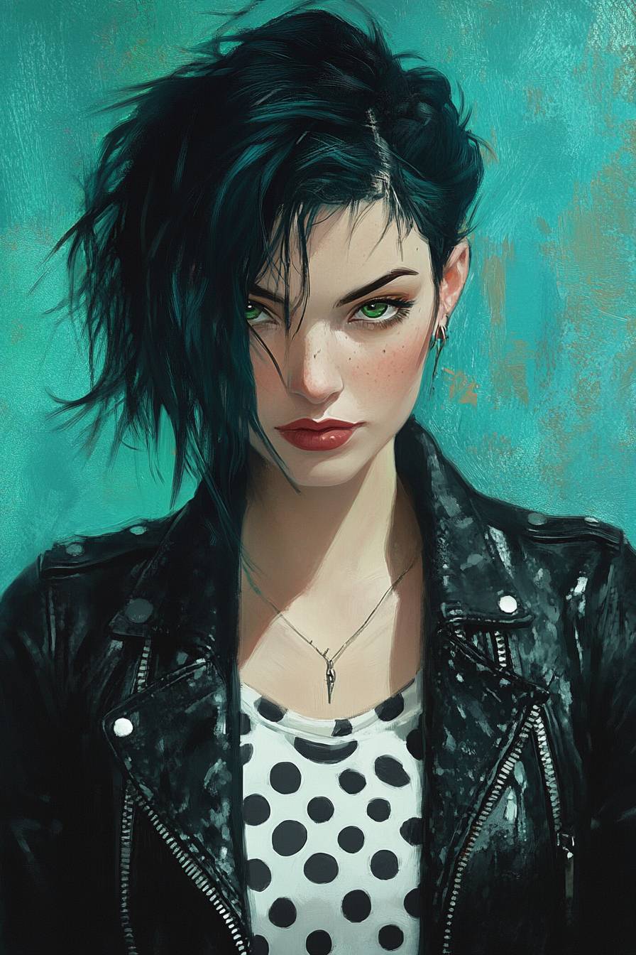 A captivating illustration of a beautiful woman with striking contrasting hair, piercing green eyes, and a sharp angular face. She wears a polka dot shirt and a black leather jacket, exuding confidence and power.