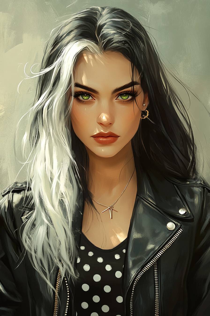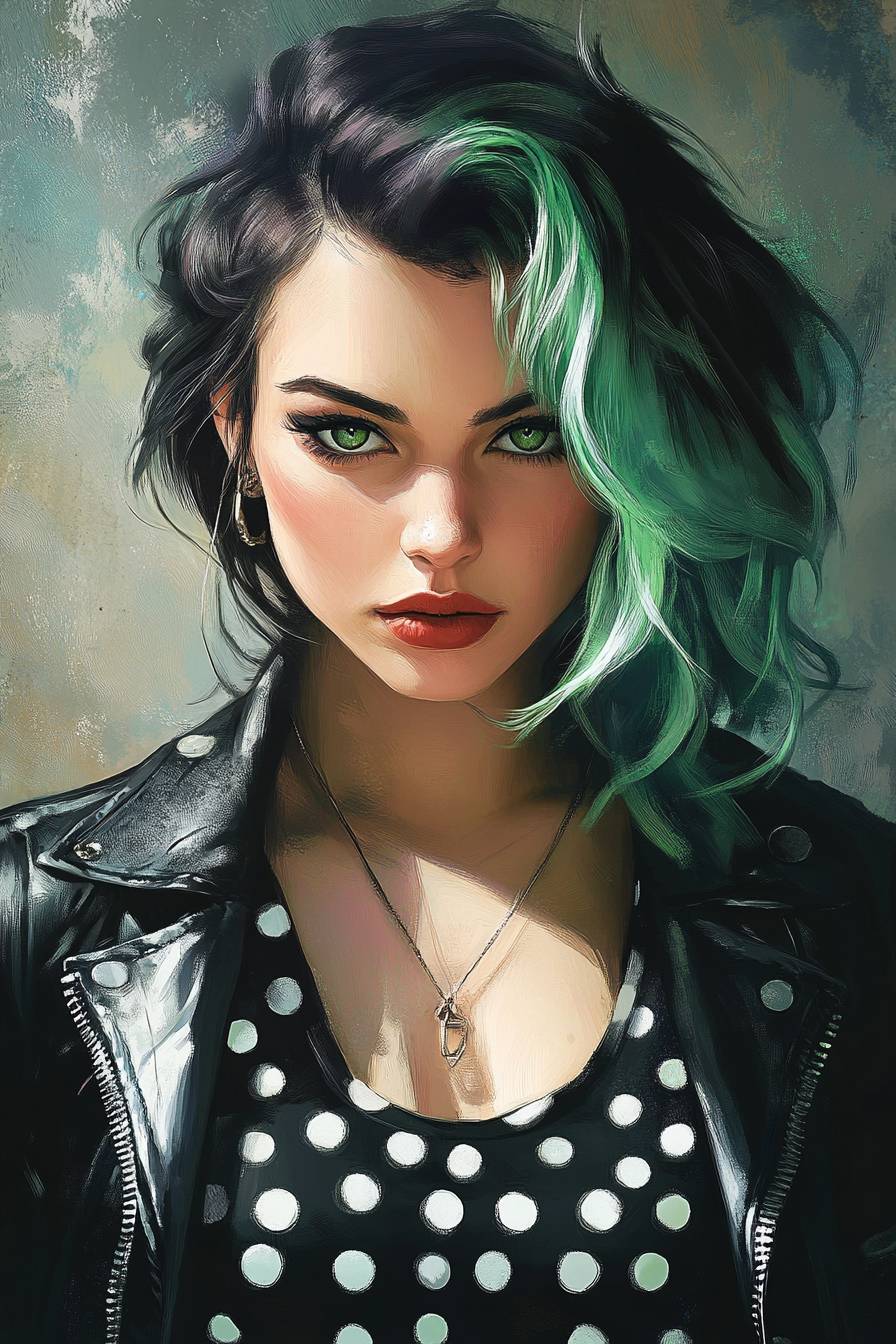 A captivating illustration of a beautiful woman with striking contrasting hair, piercing green eyes, and a sharp angular face. She wears a polka dot shirt and a black leather jacket, exuding confidence and power. --v 6.1 --ar 2:3