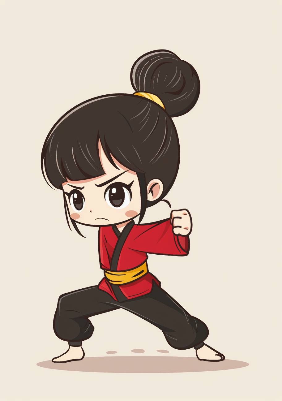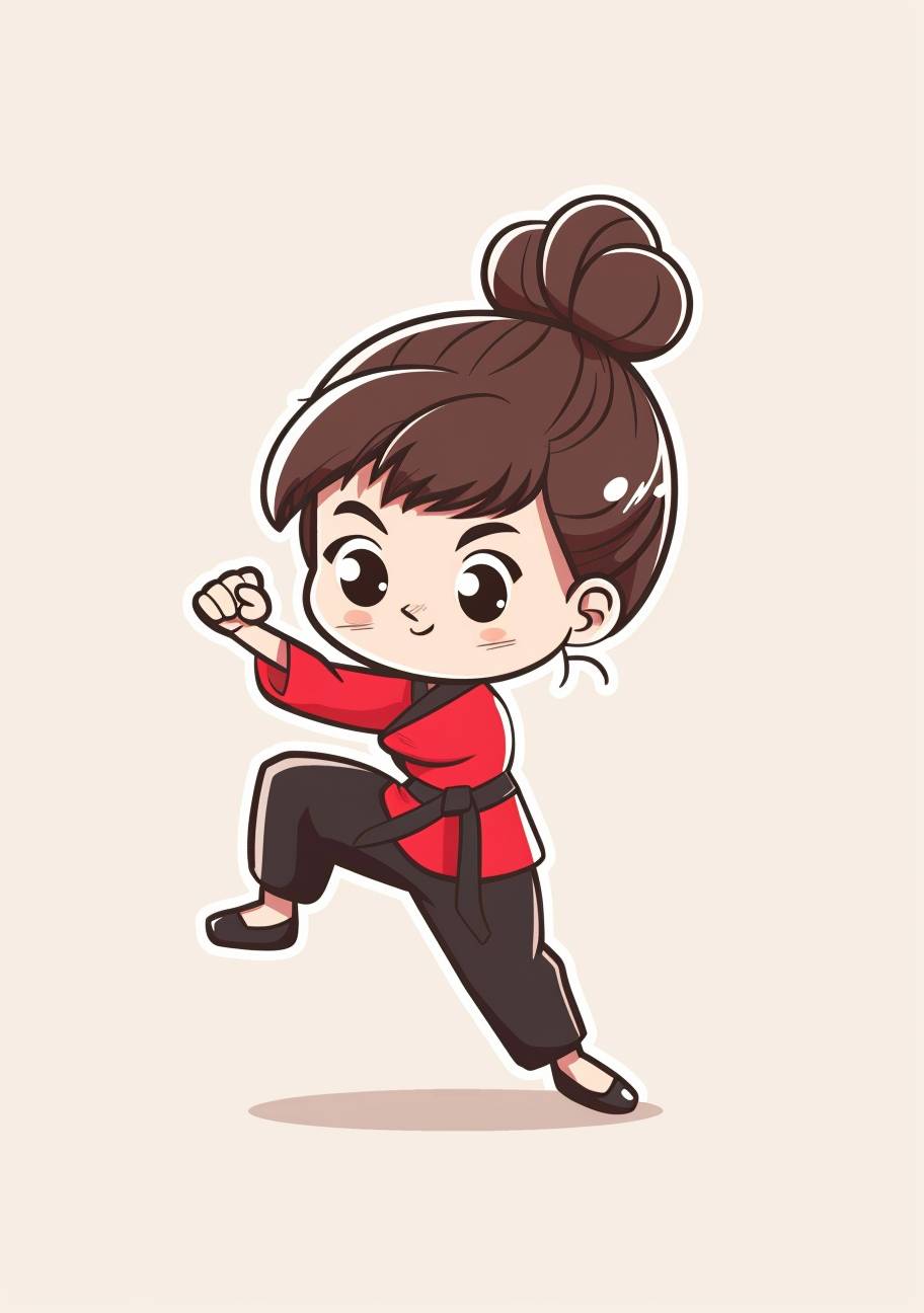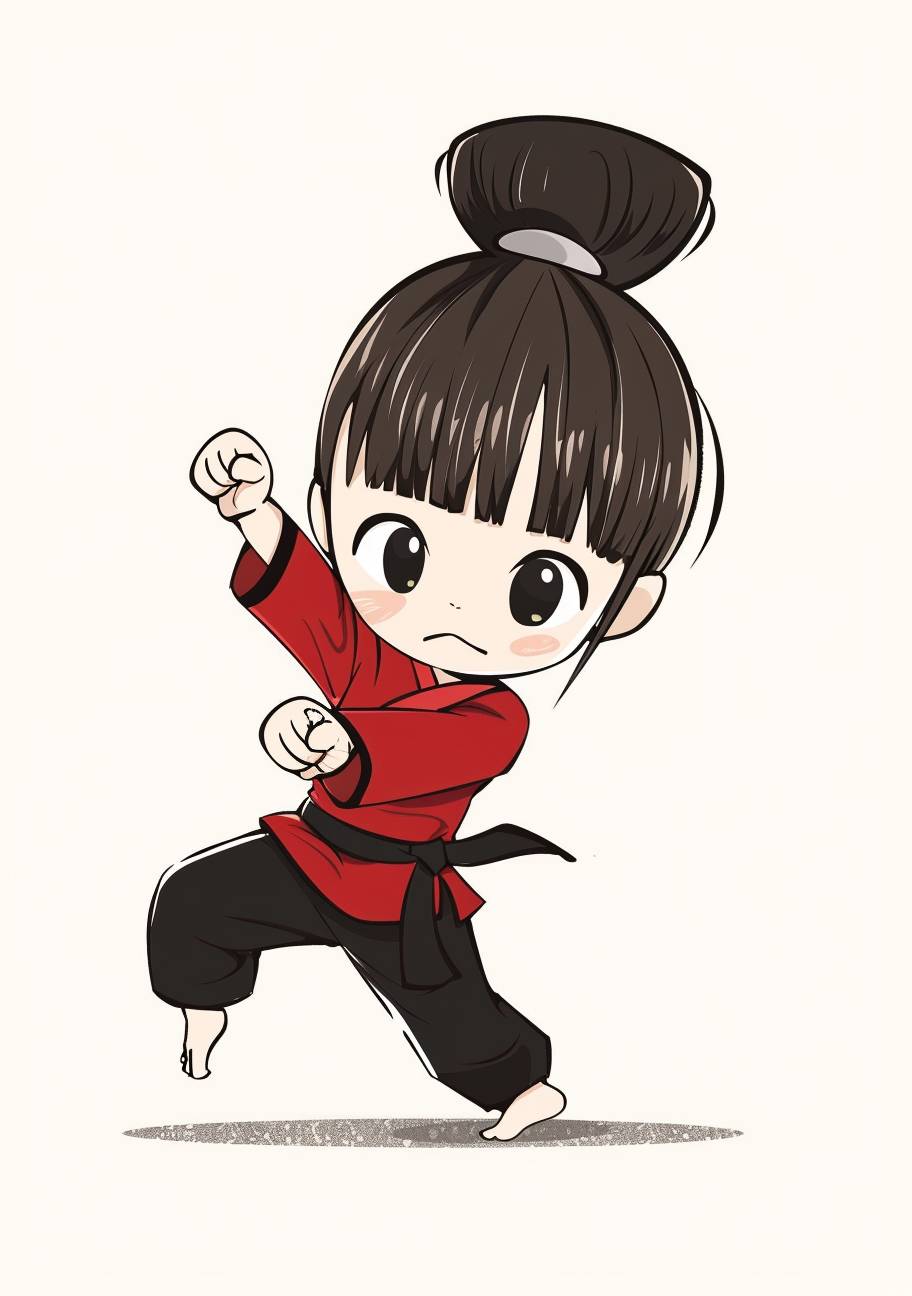 A cute little girl doing karate in a simple chibi style drawing with a simple flat color background. A full body, side view cartoon character design with high resolution and detailed facial features in a hand drawn illustration. The cute and dreamy Asian female character uses solid lines. Her cute cartoon avatar has an updo bun in the middle of her head, wearing a red shirt and black pants in a jumping kick pose. It is a high quality, high detail drawing with solid colors, simple line art and solid coloring. In the background is white paper with high definition. --ar 45:64 --v 6.0