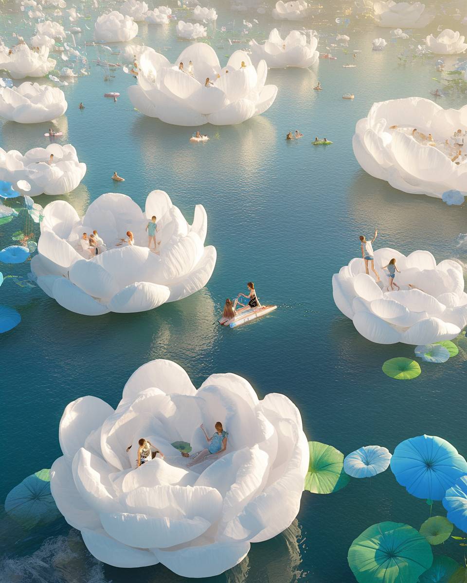 Giant inflatable flowers on the river, people swimming inside, architecture photography in the style of Richard Misrach and Christo, inflatable white clouds floating above the water. --ar 35:44 --niji 6