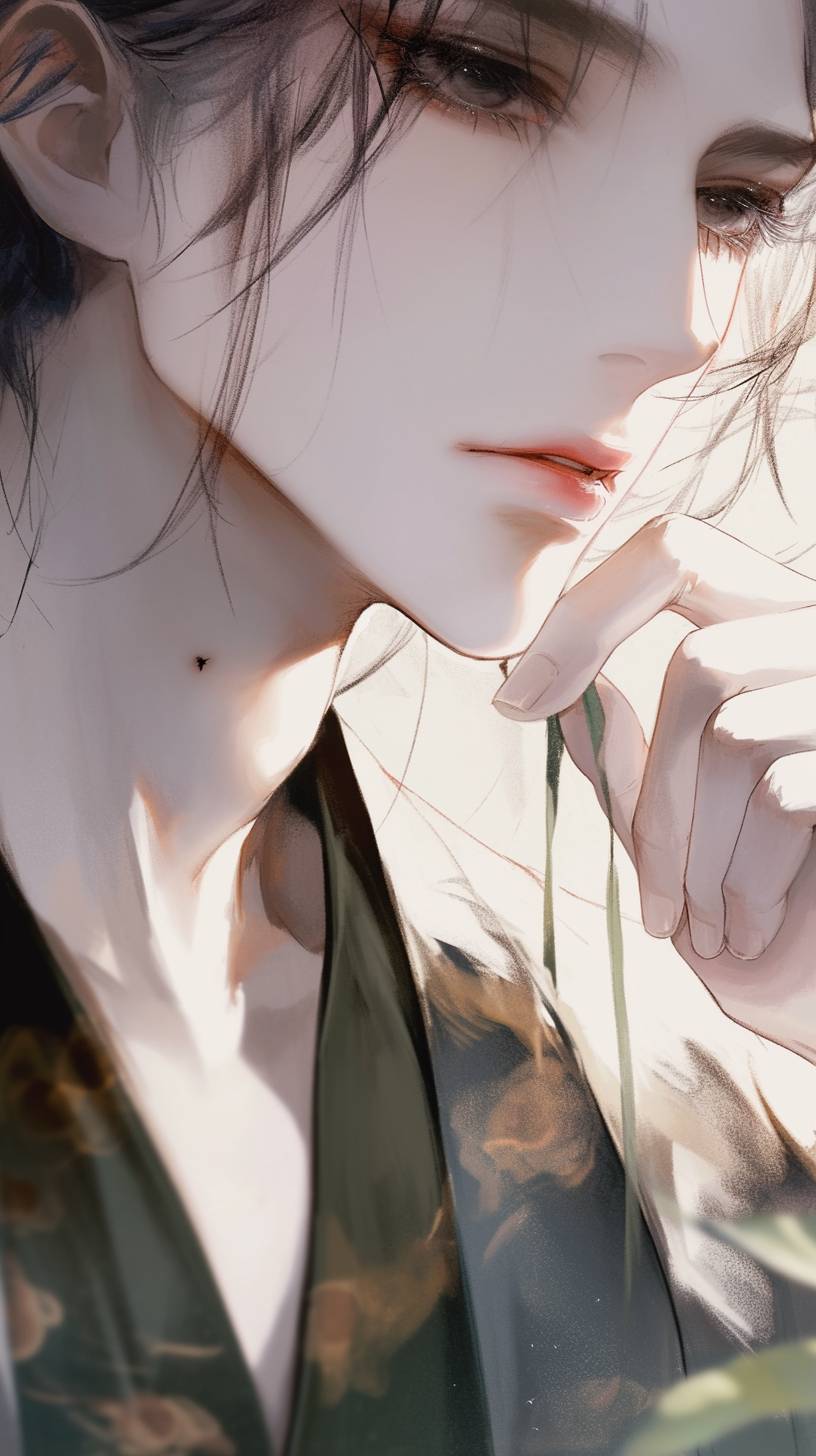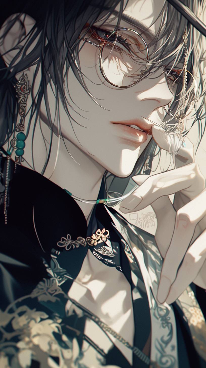 A comic-style close-up, pale skin, smooth, jade style, bold colors, inspired by anime characters, anime style, ruddy lips, slightly drooping eyelashes, shining eyes, secondary element, hand-painted style, black lines are obvious, close-up of the face, painting of an adult man, black eyes, dark pupils, black hair, short hair, large back head, new Chinese clothes, double-buttoned Tang suit, Republic of China style, bamboo embroidery, gorgeous and cumbersome embroidery, bead curtain, There is an emerald green jade bead string hanging around his neck, his mouth is slightly open, and a finger is stuck between his lips. He squints coldly and has disdainful eyes. He has a strong figure, wide shoulders and narrow waist, fair skin. He wears glasses. --ar 9:16 --style raw --stylize 200 --niji 6