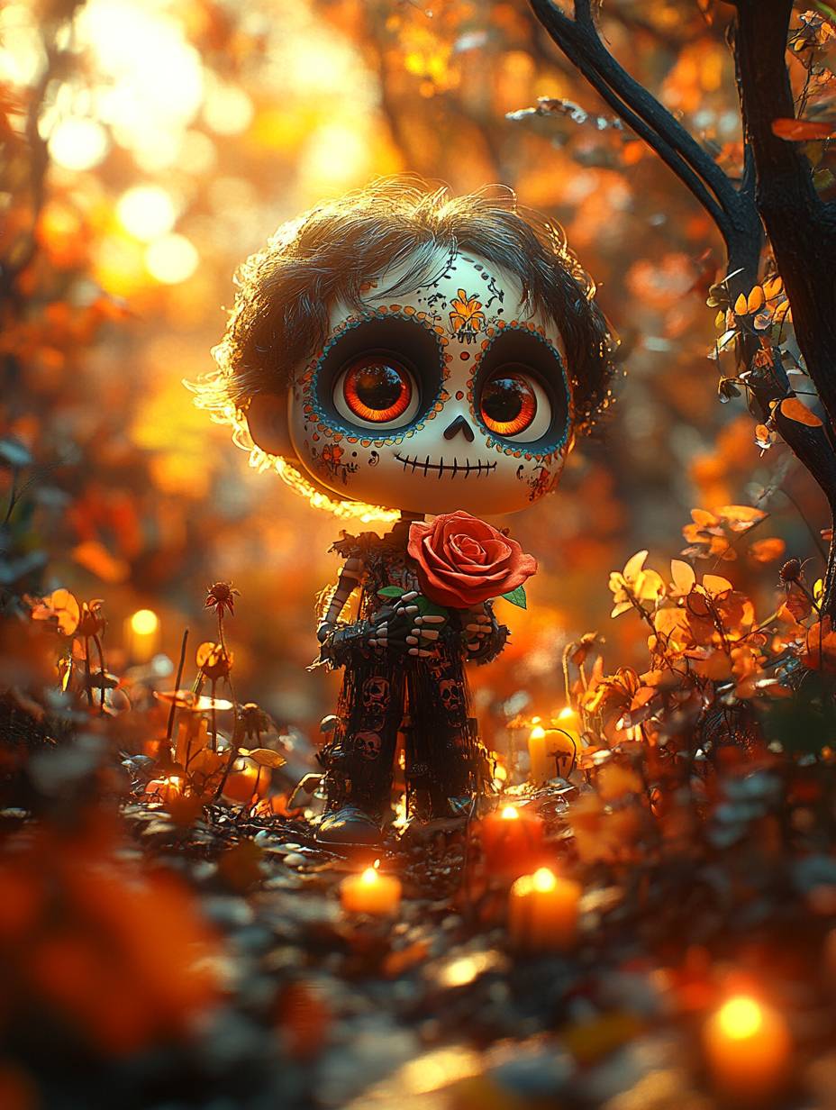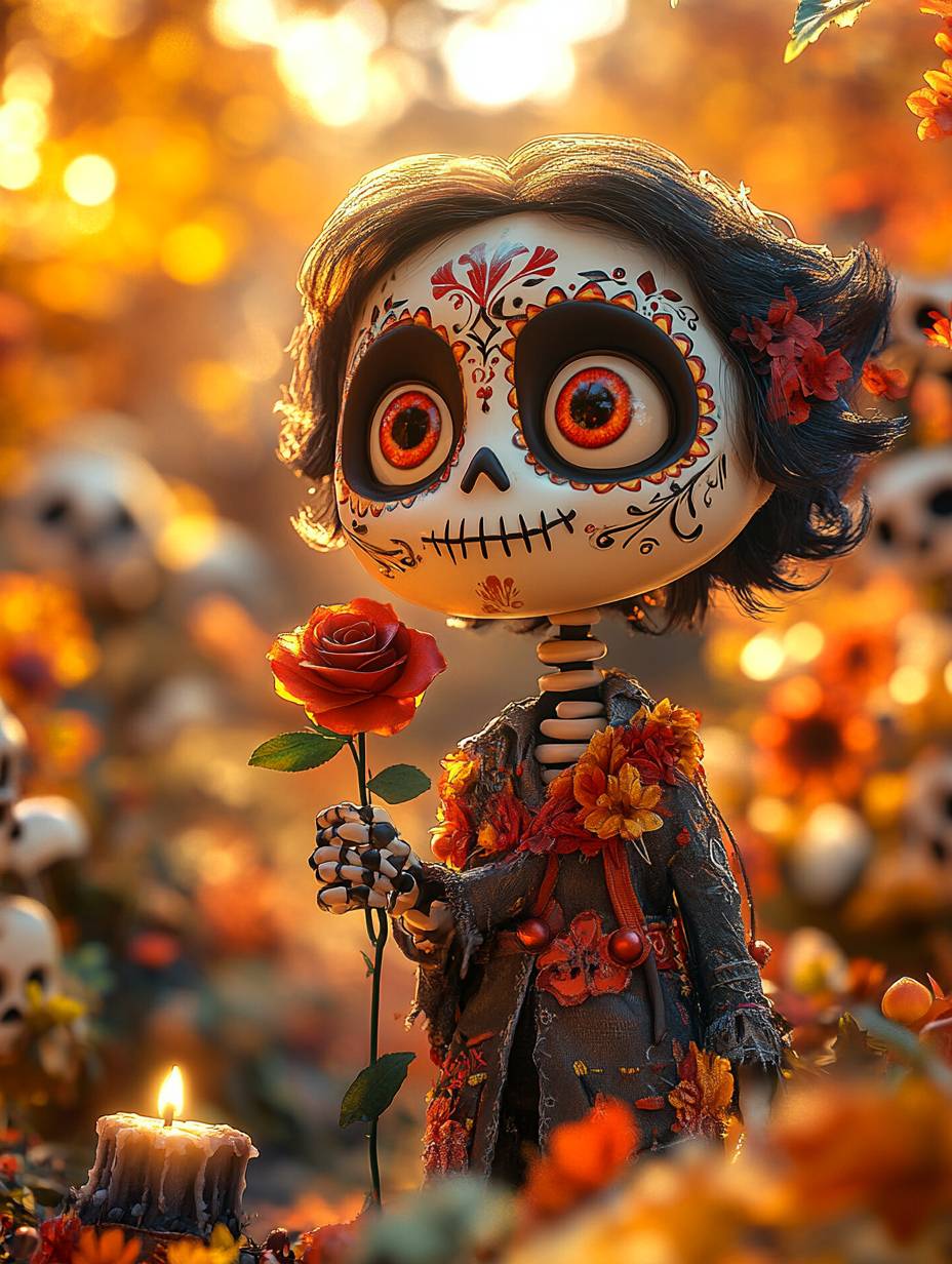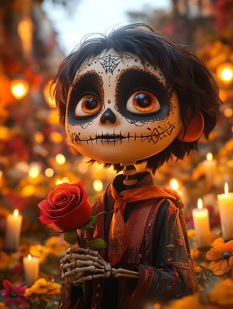 A beautiful Day of the Dead prince holding his rose, in the style of Pixar, with orange and yellow lighting, candles, and flowers in the background. he has skull face makeup, big eyes, and a chibi-style appearance. This is a 3D render, and a bokeh effect creating a cinematic atmosphere. --ar 3:4 --stylize 750 --v 6.1