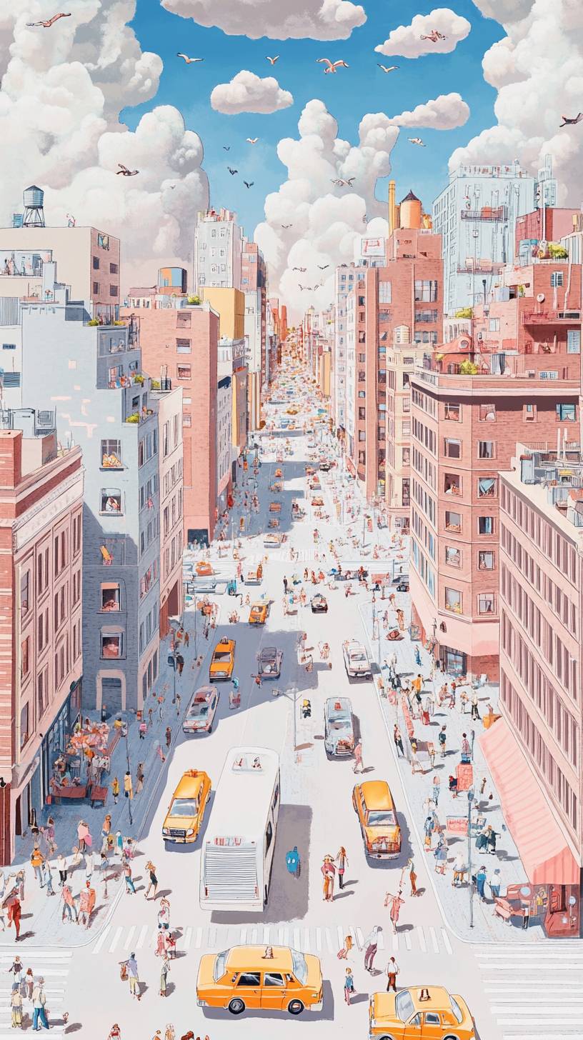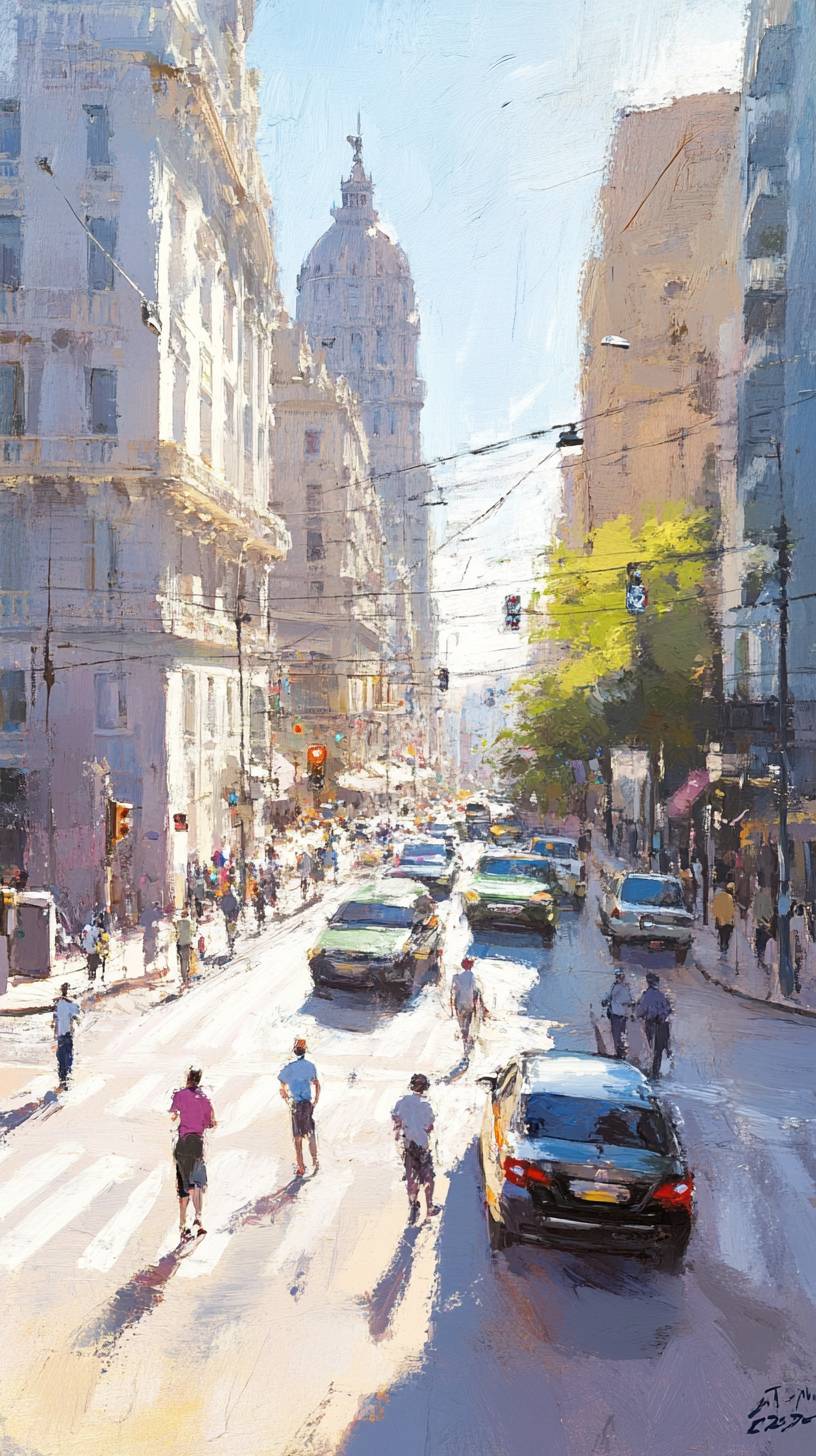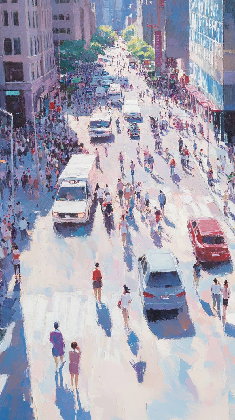 (Retro and modern interwoven vitality style, through bright color contrast and period symbols, to show the optimism and vitality of the new era.) Panoramic view, city streets bathed in warm sunlight, people's faces filled with smiles, light and shadow patchy, creating a positive atmosphere. --ar 9:16 --personalize xcdndg6 --v 6.1