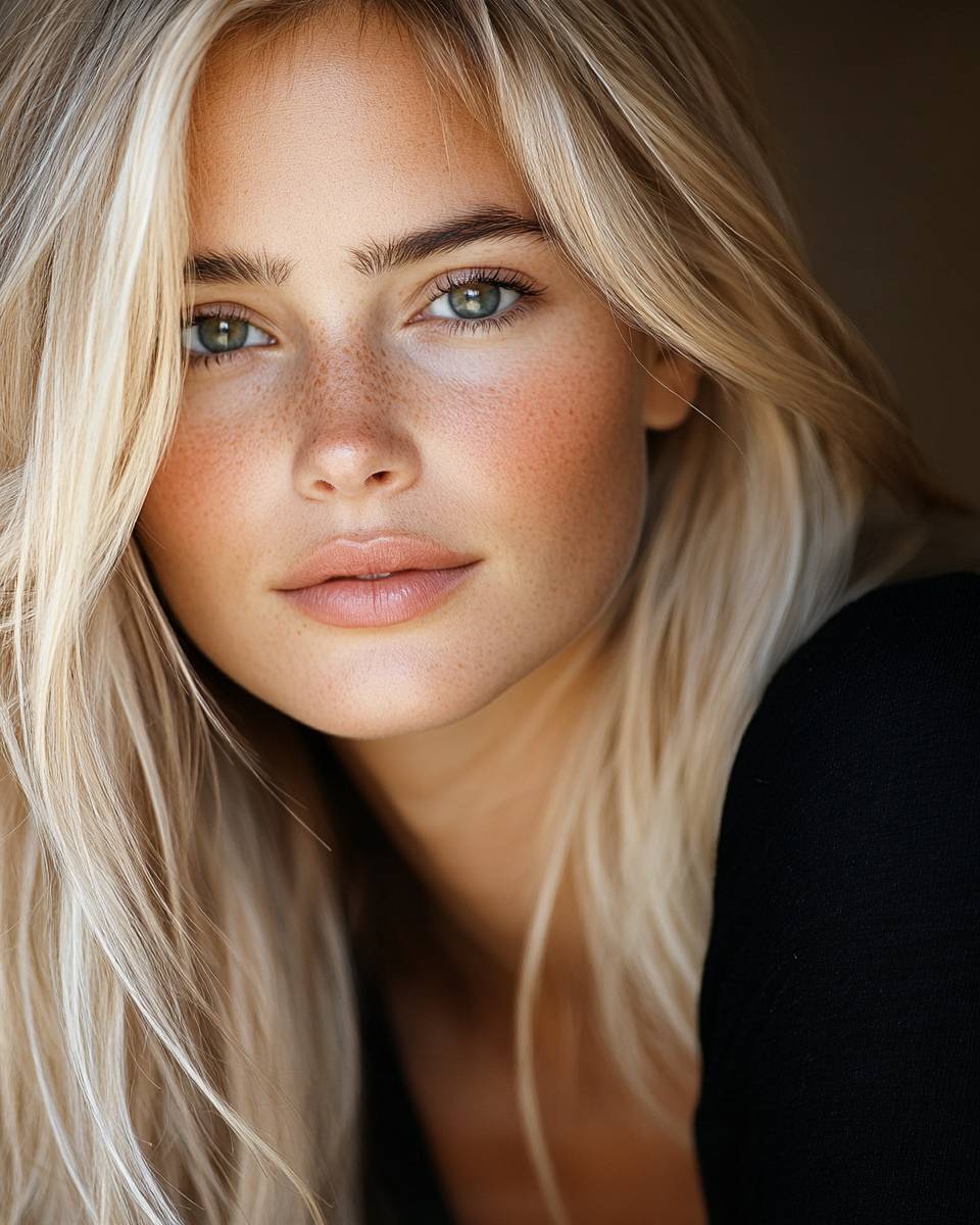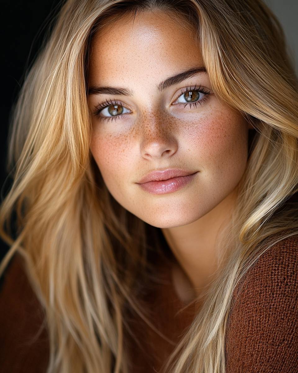 A close-up photograph of a gorgeous 28-year-old northern Italian woman with lovely long blonde hair. Wearing makeup, with symmetrical facial features, she exudes warmth and richness. She looks alive, a real person with a normal skin tone, natural-looking skin, and red blush on her cheeks. The lighting features backlight or Rembrandt lighting, and the model has a confident smile in spring. Eyes are in focus, shot using a Nikon F5 with an 85 mm f5.6 lens, with eyeshadow. The overall atmosphere is bold yet inviting, perfect.