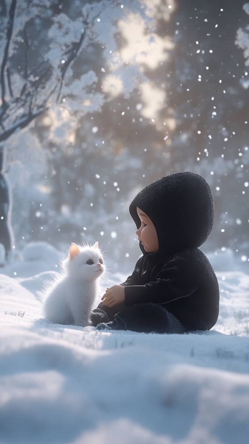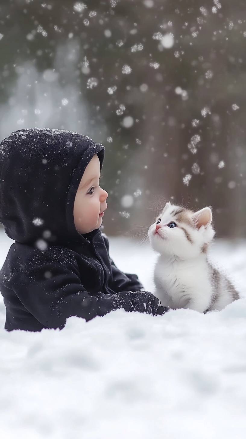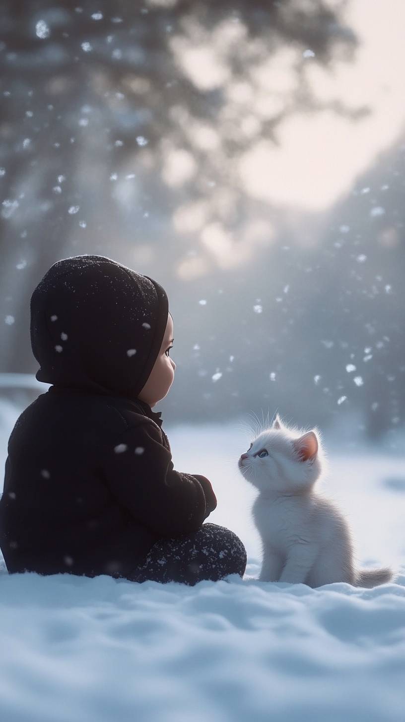 In this adorable and realistic video, a 2-year-old baby sits on a soft blanket of fresh snow in a quiet, snow-covered park. The baby, dressed in a cozy black hoodie, looks joyfully at a small, fluffy white kitten cradled in his lap. The scene captures the child's bright, excited expressions as he gently pets the kitten, which looks up at him with curious, sparkling eyes. The background features gently falling snowflakes and frosty trees, enhancing the magical winter atmosphere. This video focuses on the innocent wonder of the baby and the gentle, trusting nature of the kitten, creating a heartwarming moment of companionship against the serene and picturesque snowy landscape. --ar 9:16 --v 6.1