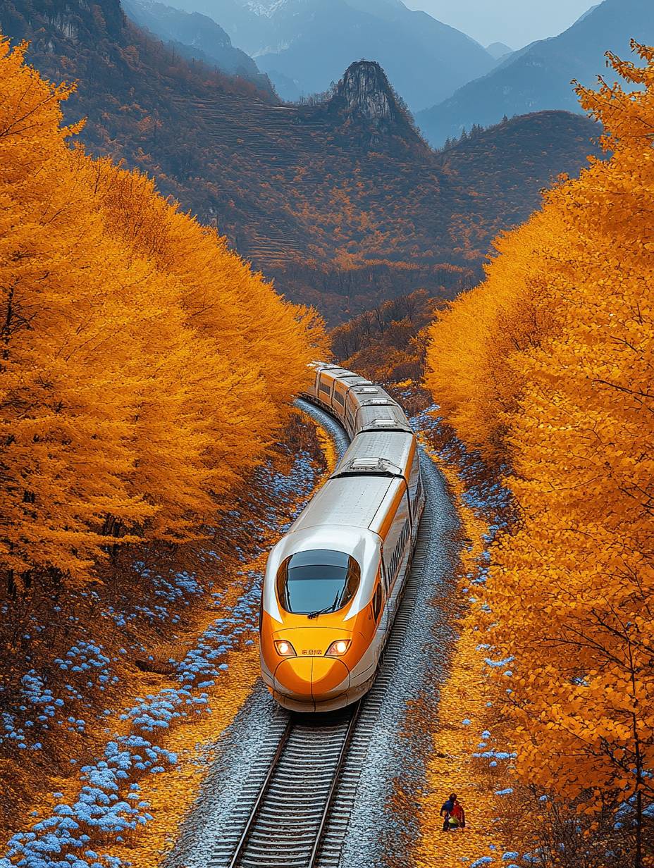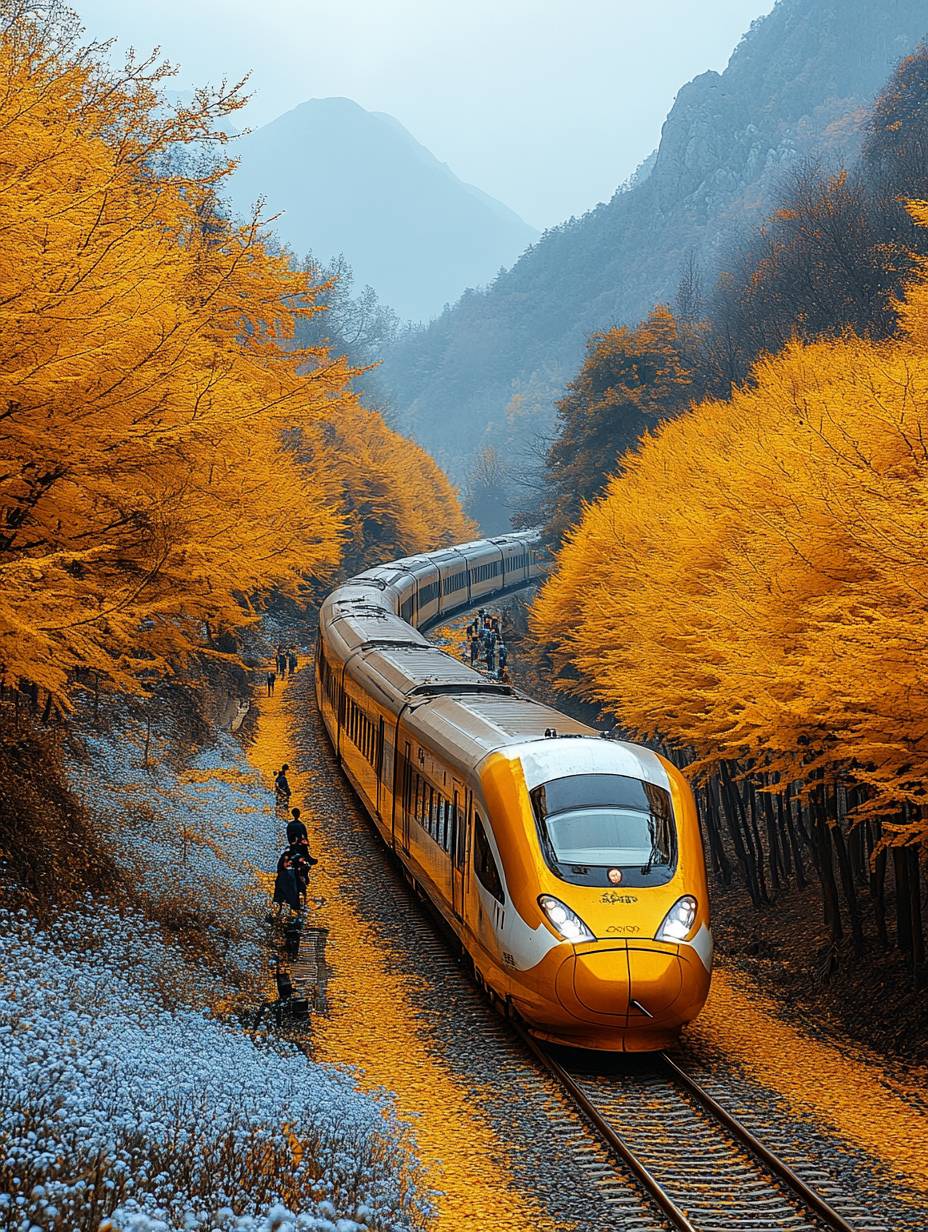 In autumn, the high-speed train runs through an ancient forest full of yellow leaves and blue wildflowers on both sides. The mountains in China stand behind it. It is beautiful scenic photography with high-definition details. A large number of golden fallen ginkgo trees stand along the tracks. White flowers bloom under their branches. High-speed trains pass by, and people have fun playing happily next to them. Realistic photos were taken using Nikon cameras. This photo was captured in the style of National Geographic magazine. --ar 3:4 --stylize 750 --v 6.1