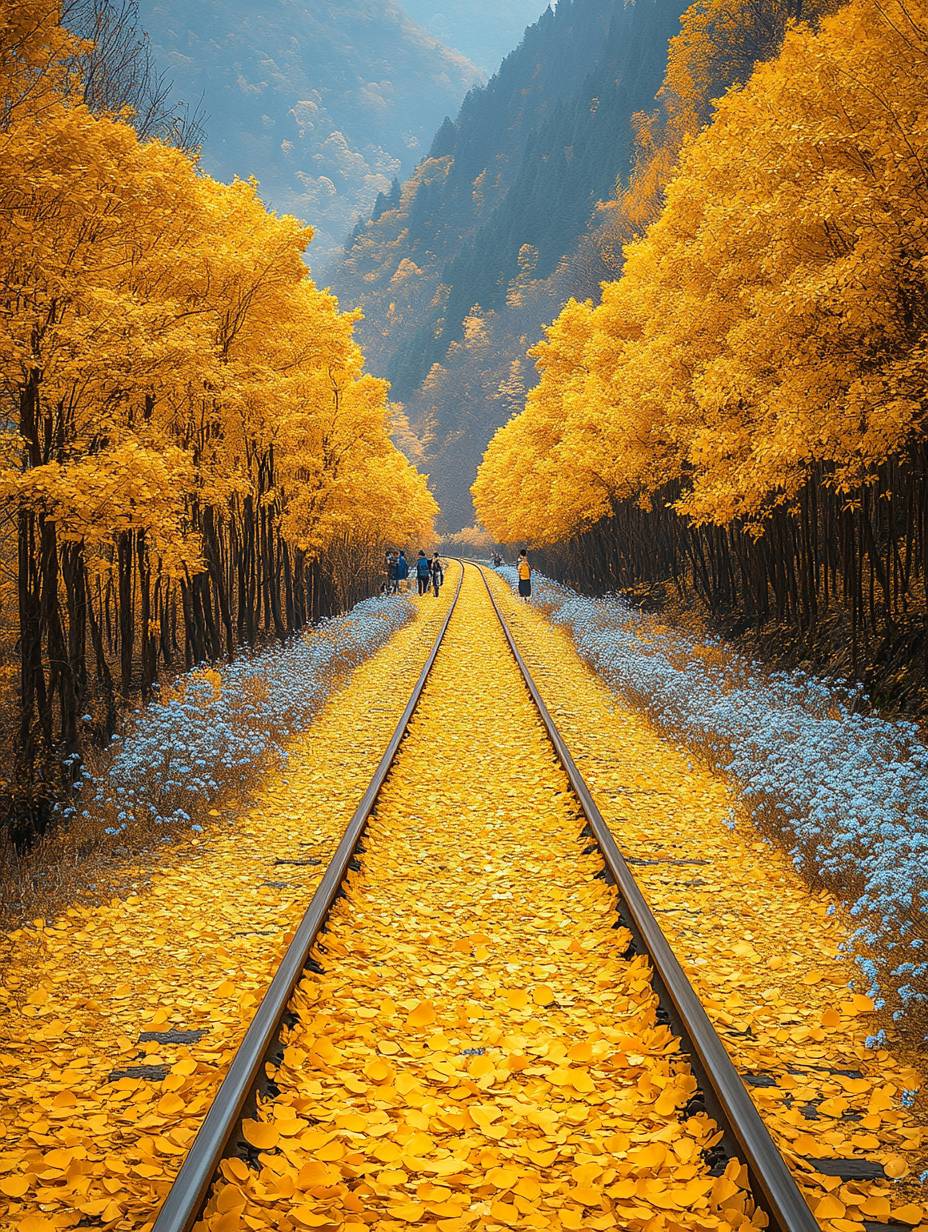 In autumn, the high-speed train runs through an ancient forest full of yellow leaves and blue wildflowers on both sides. The mountains in China stand behind it. It is beautiful scenic photography with high-definition details. A large number of golden fallen ginkgo trees stand along the tracks. White flowers bloom under their branches. High-speed trains pass by, and people have fun playing happily next to them. Realistic photos were taken using Nikon cameras. This photo was captured in the style of National Geographic magazine.