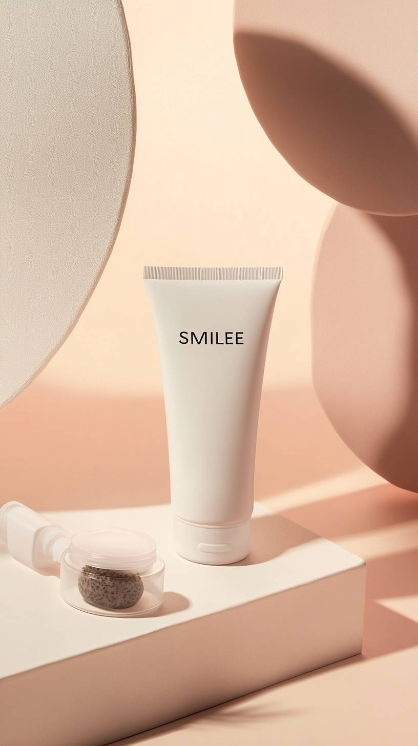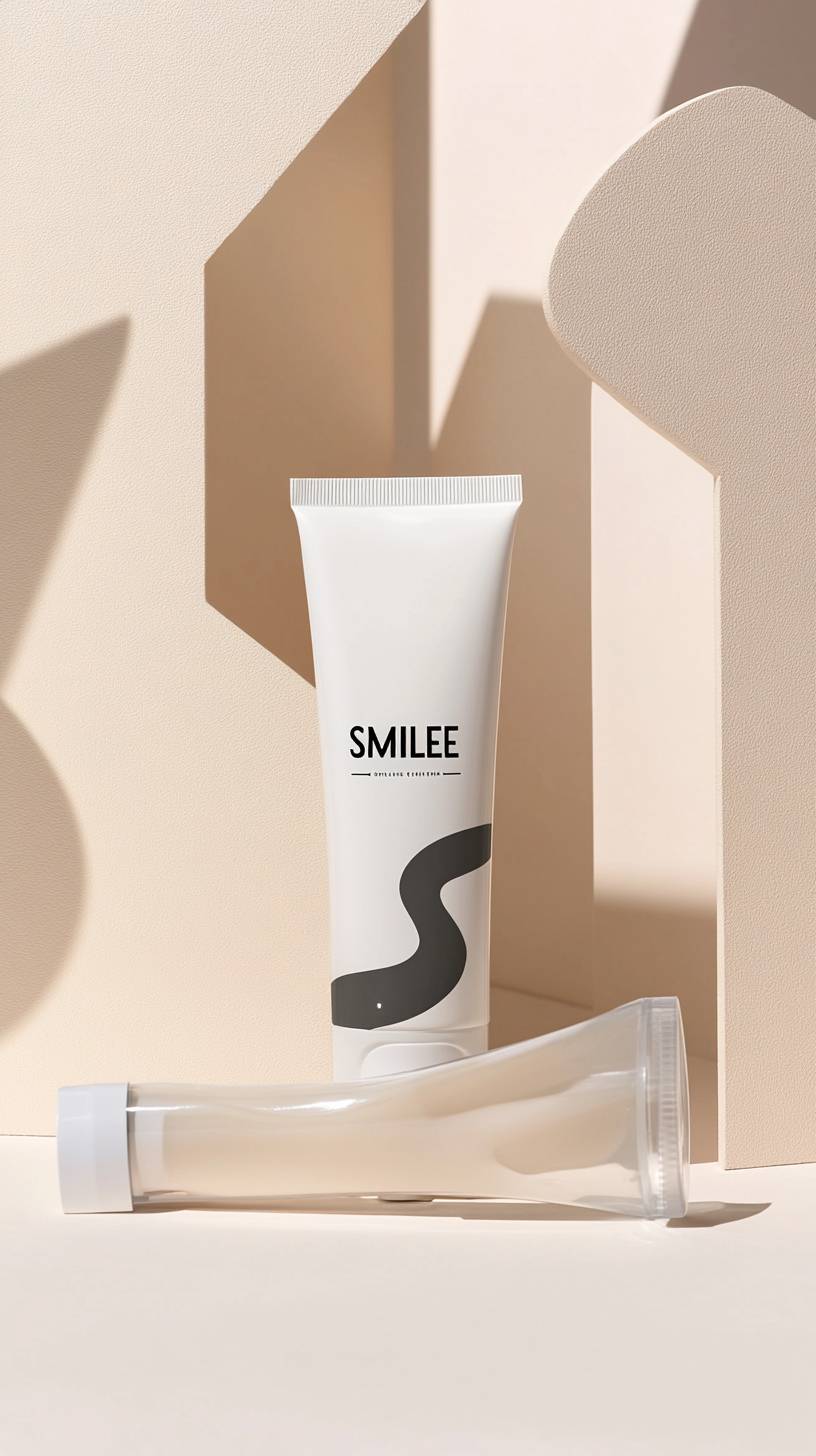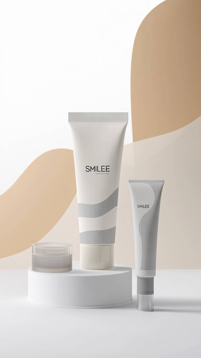 A white skin care product with the brand name "SMILEE" printed on it, in front of which is placed an empty cream tube and two shades of light gray and beige with black truffled logo patterns. The background features geometric shapes and lines. There's no text or typography. It has exquisite details, studio lighting, high-resolution photography style, soft tones, and a minimalist design aesthetic. --ar 9:16 --v 6.1