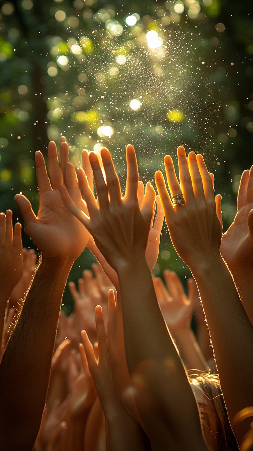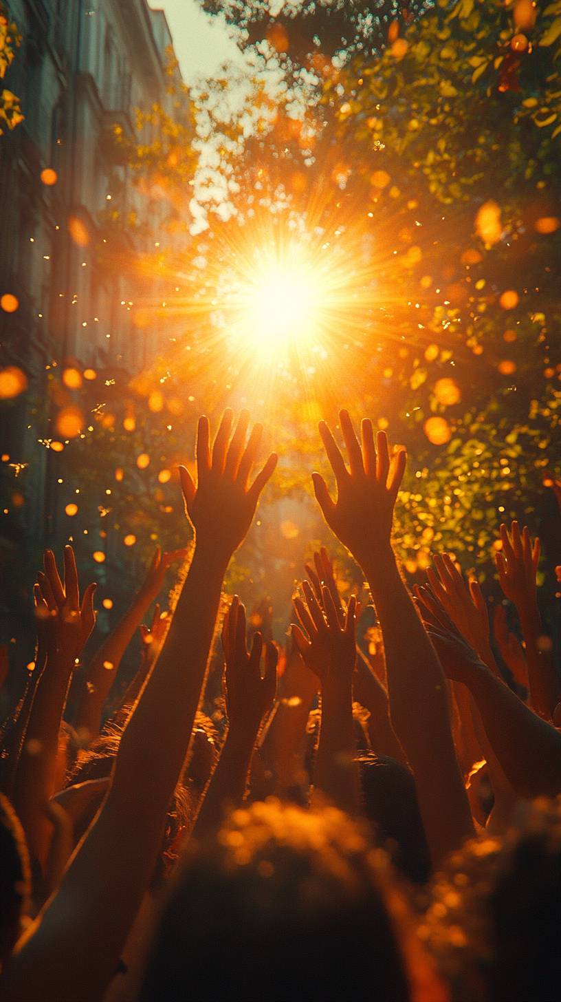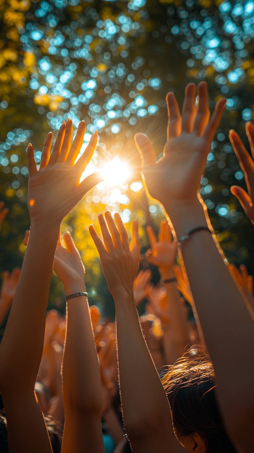 Several hands reaching towards the sun, symbolizing the collective effort of people to improve their emotional state, photorealistic, detailed, 8k, HDR, shot on Canon EOS R5, Canon RF 50 mmf/ 1.2 L USM , depth of field, --ar 9:16 --stylize 750 --v 6.1
