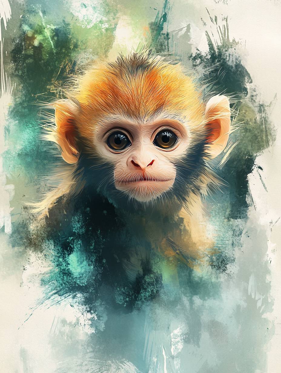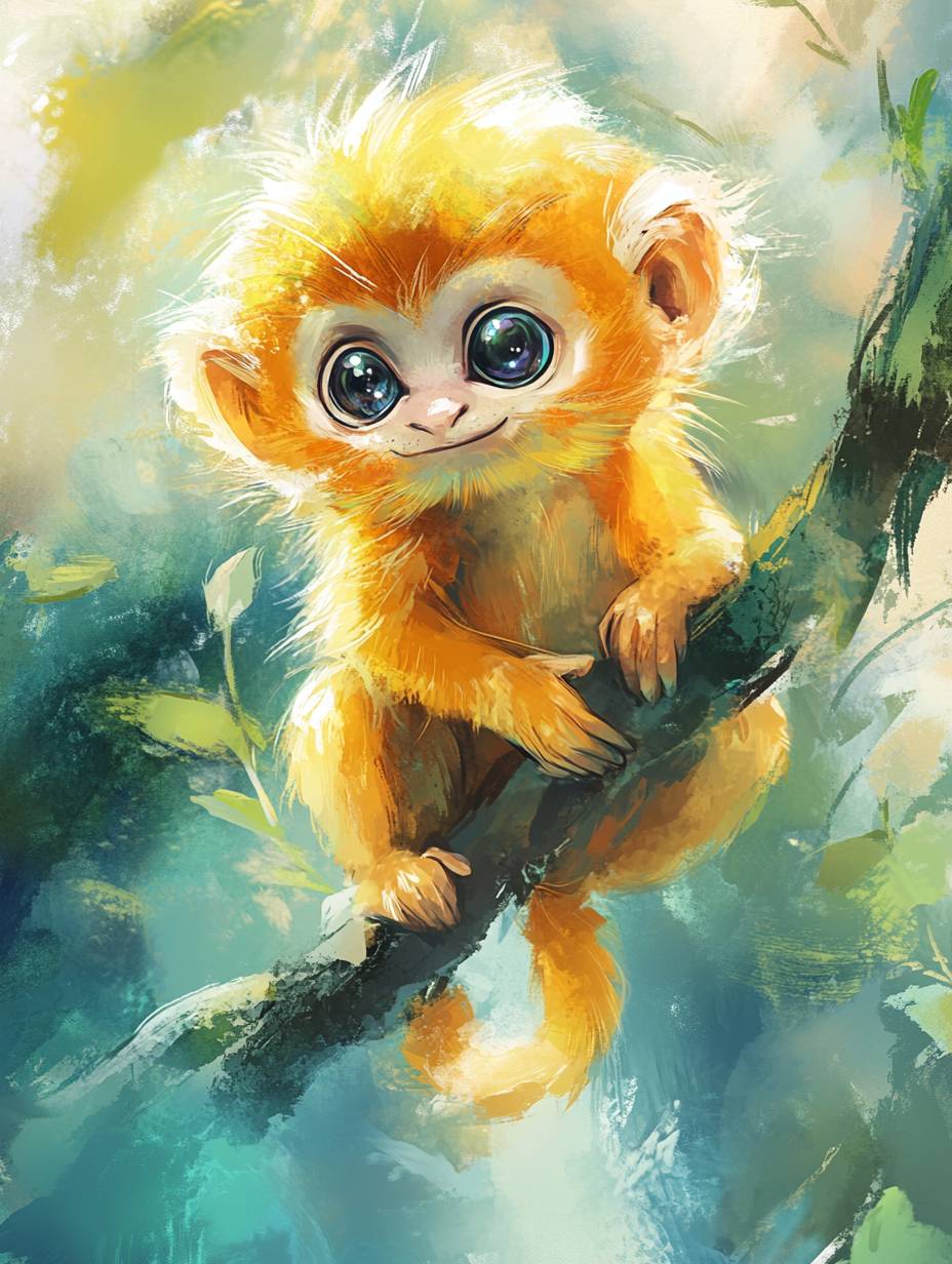 A cute golden monkey, in ink painting style, with a color palette featuring green and blue summer tones, cute and dreamy. The illustrations are detailed and complex, using watercolor like digital painting techniques with high resolution and clear focus. --ar 3:4 --v 6.1