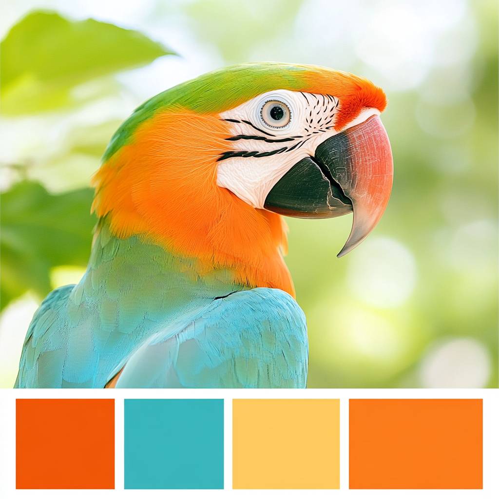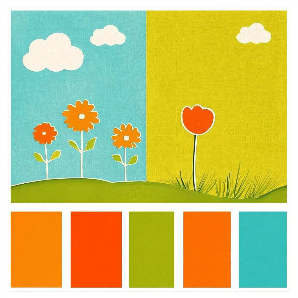 Show a color palette using bright, cheerful tones like vibrant orange, apple green, and sky blue to convey playfulness, energy, and exploration. These colors appeal to both kids and evoke positive emotions.