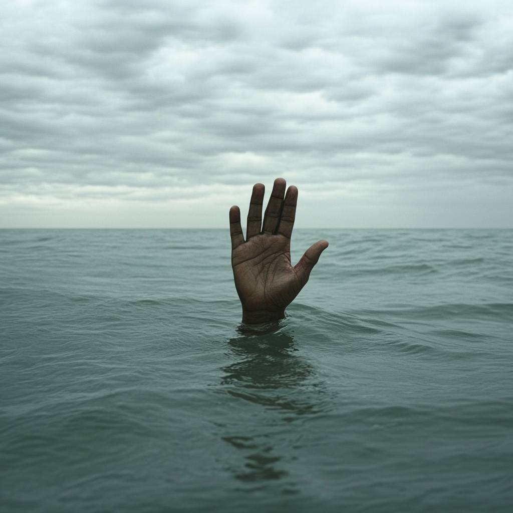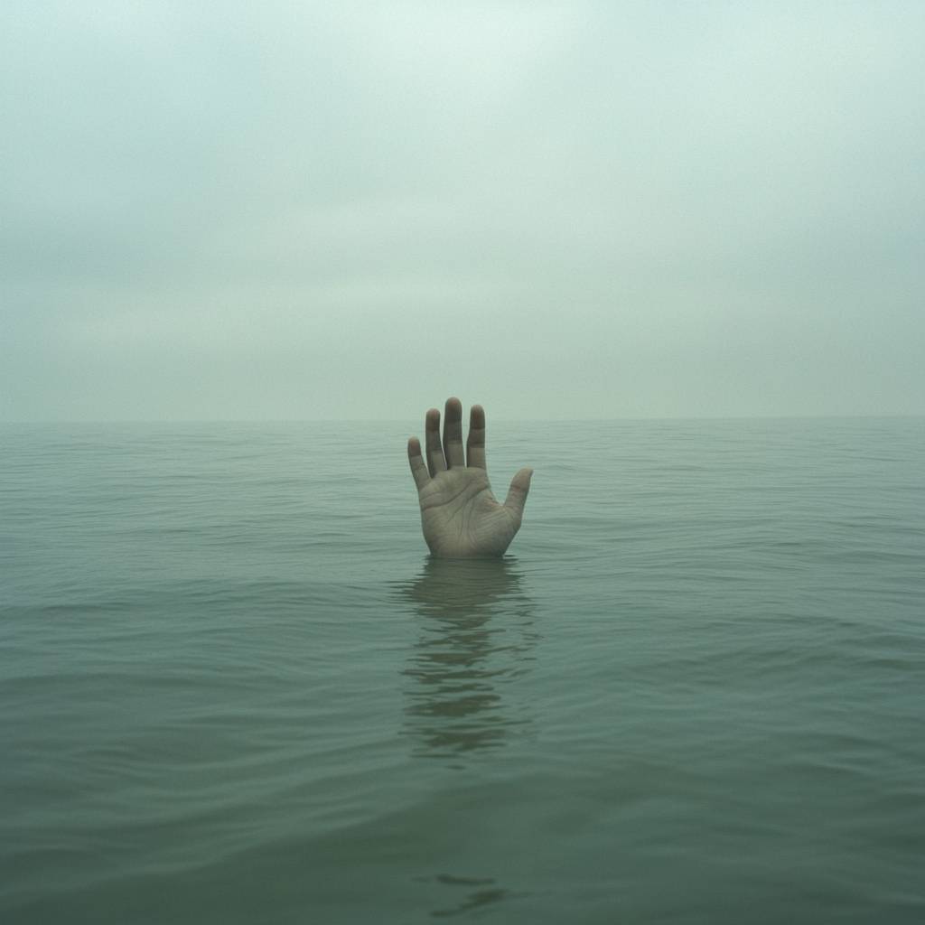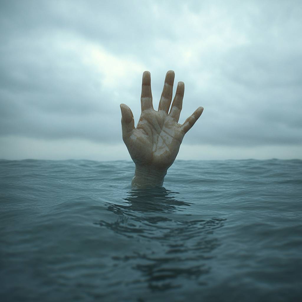 A hand is sticking out of the water with a grey gloomy atmosphere.