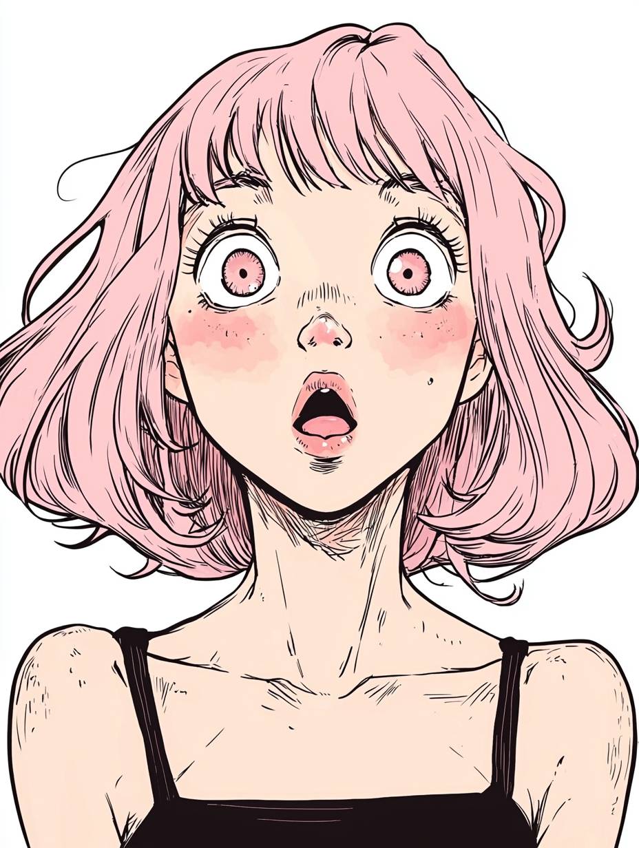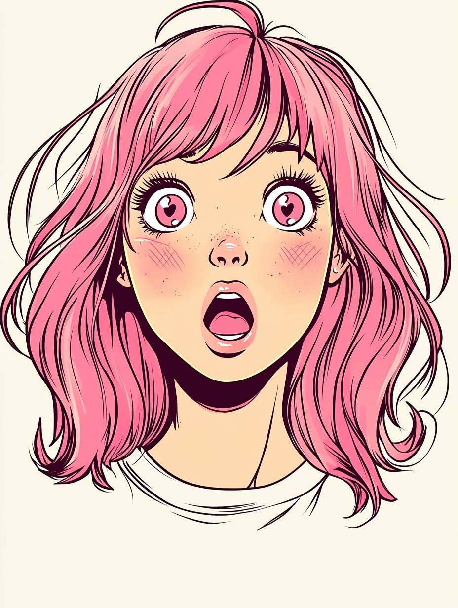 front view, Cute teenage girl, Pale pink hair color, She's in love and blushing, She's adorably surprised, Her pupils are heart-shaped, emo, Emo coloring, Simple Manga, Japanese Manga, flat colors, --ar 3:4 --quality 2 --v 6.1