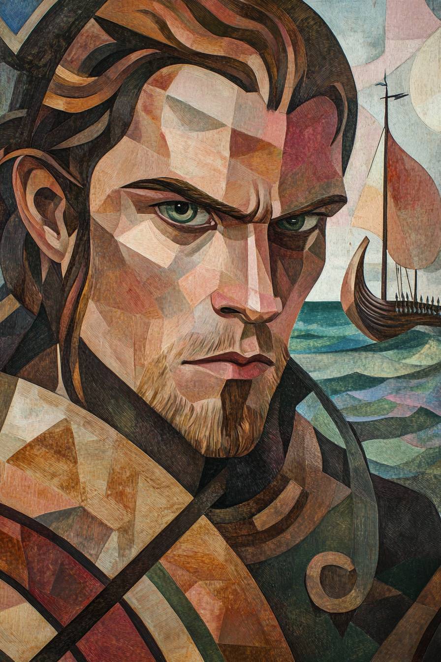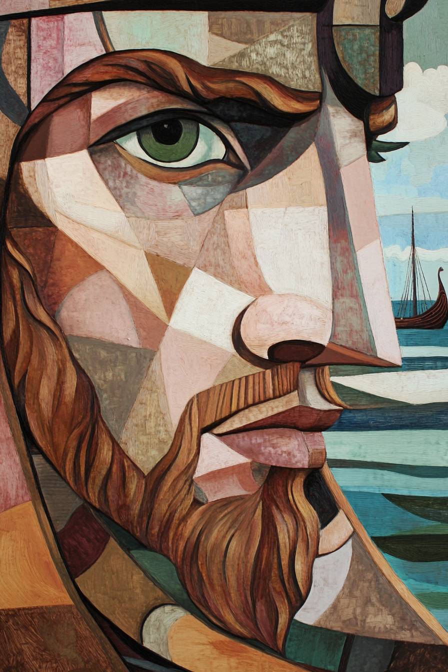 a cubist painting in the style of Tamara Lempicka, depicting a Viking with brown hair, pale skin and large green eyes, he has a fighting expression on his face, carrying a wooden shield. In the background, the viewer sees the sea, a Viking ship with contrasting colors such as pink, cream, cerulean and midnight blue, brown, dark and light shades of green. A mystical scene. --ar 2:3 --v 6.1