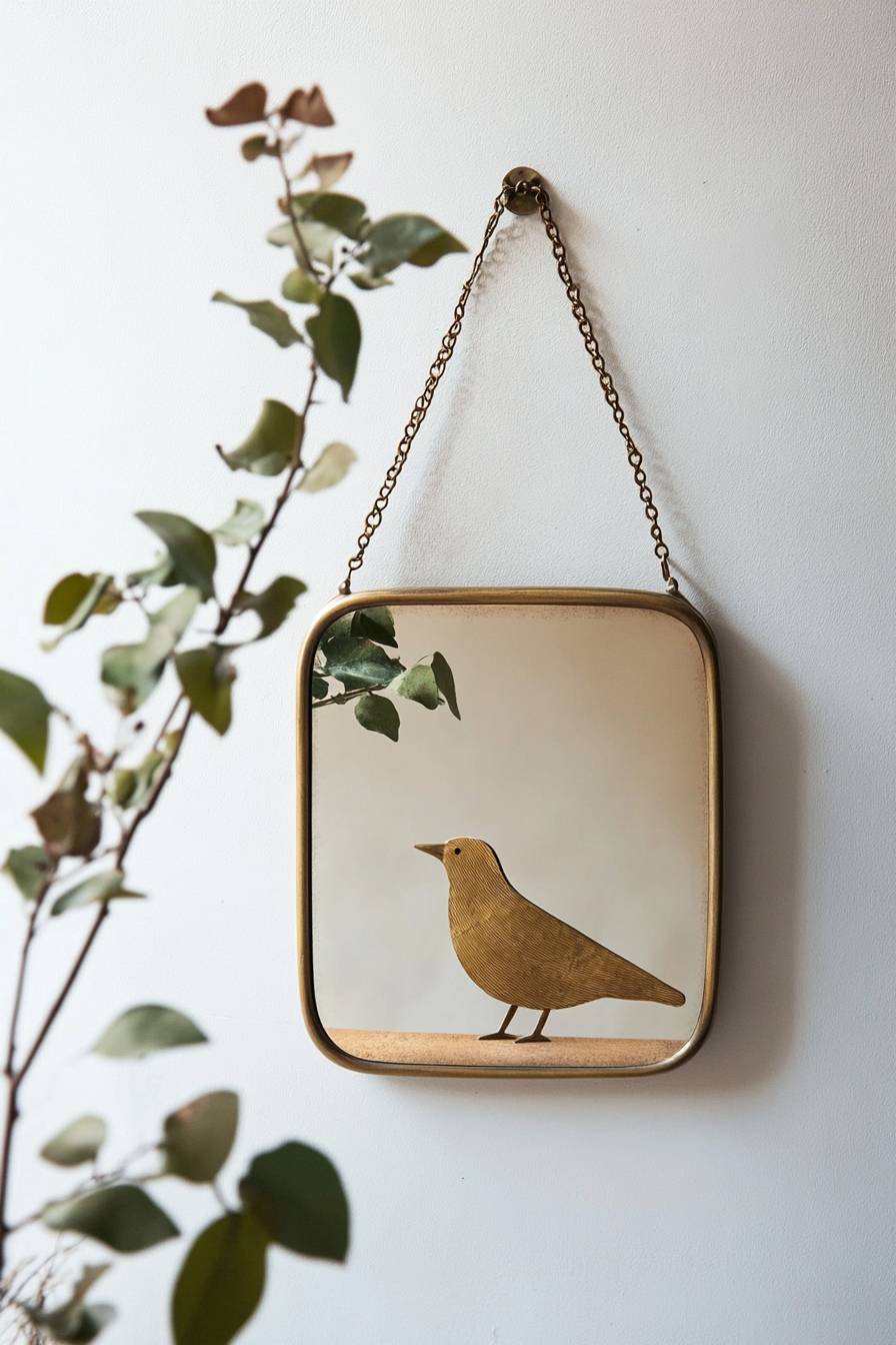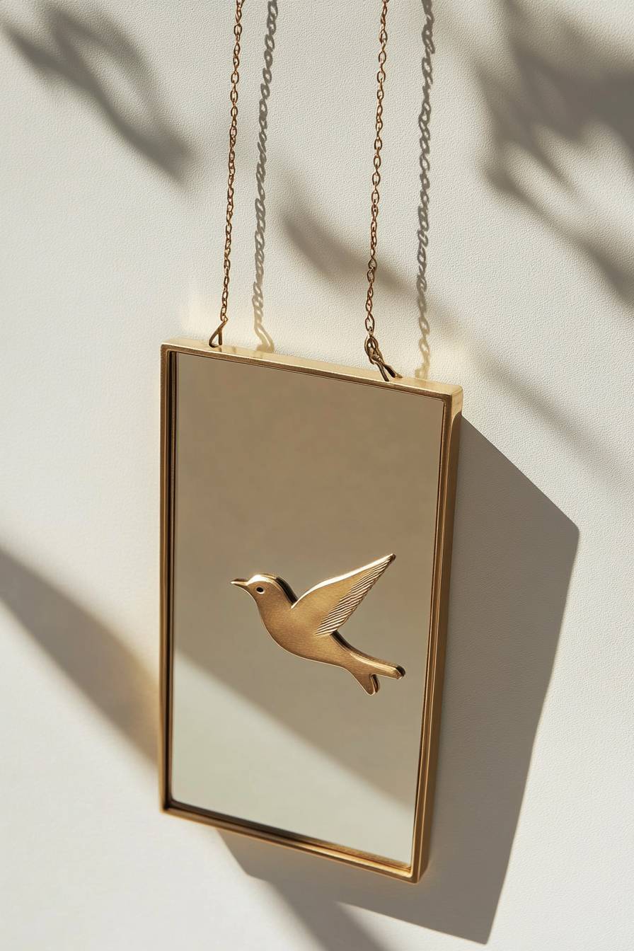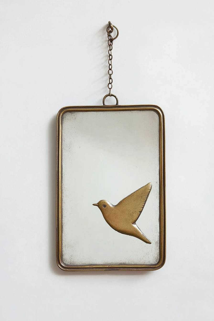 A small brass rectangular mirror with a hanging chain and a bird-shaped handle.