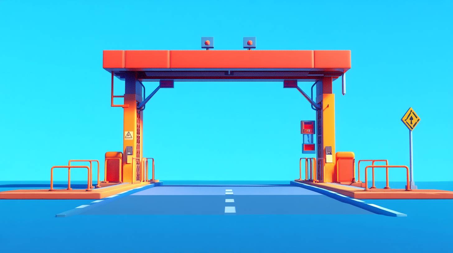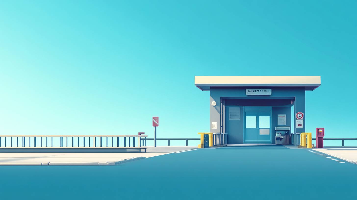 A weighbridge station, viewed at eye level, set against a solid blue background, rendered with 3D cartoon effects. --ar 16:9 --v 6.1