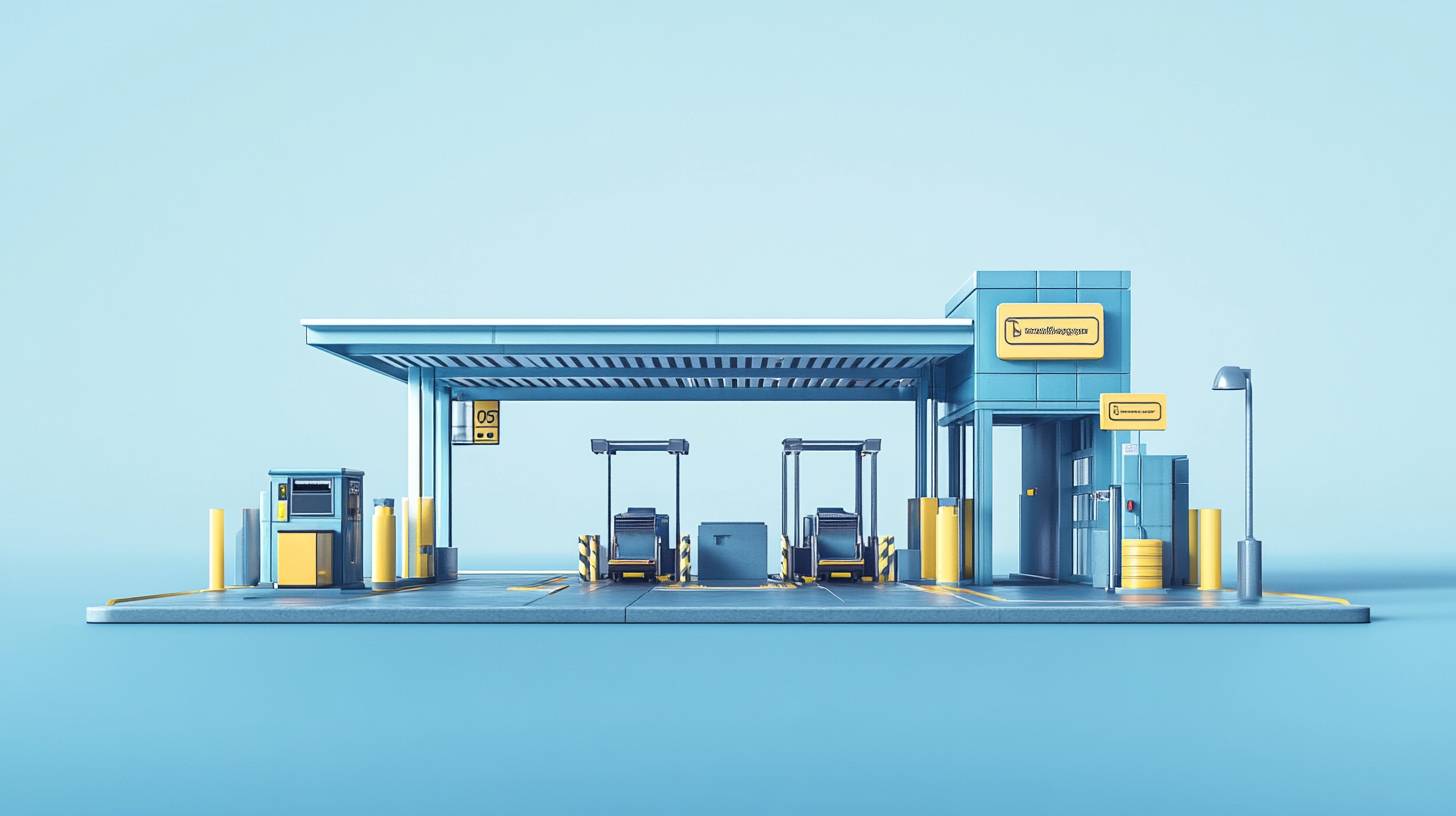 A weighbridge station, viewed at eye level, set against a solid blue background, rendered with 3D cartoon effects.