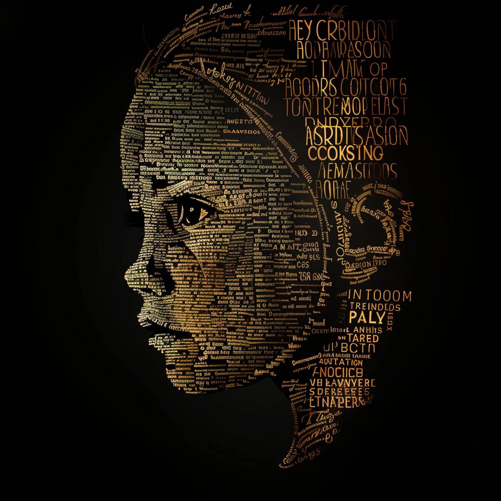 A portrait of a child made of words, in the style of vector illustration, golden light, high contrast, silhouette lighting, black background, typography art --v 6.0