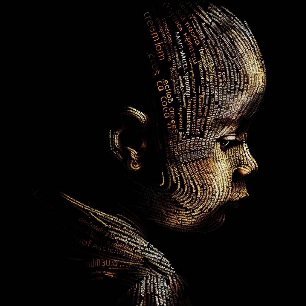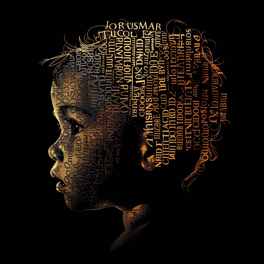 A portrait of a child made of words, in the style of vector illustration, golden light, high contrast, silhouette lighting, black background, typography art.