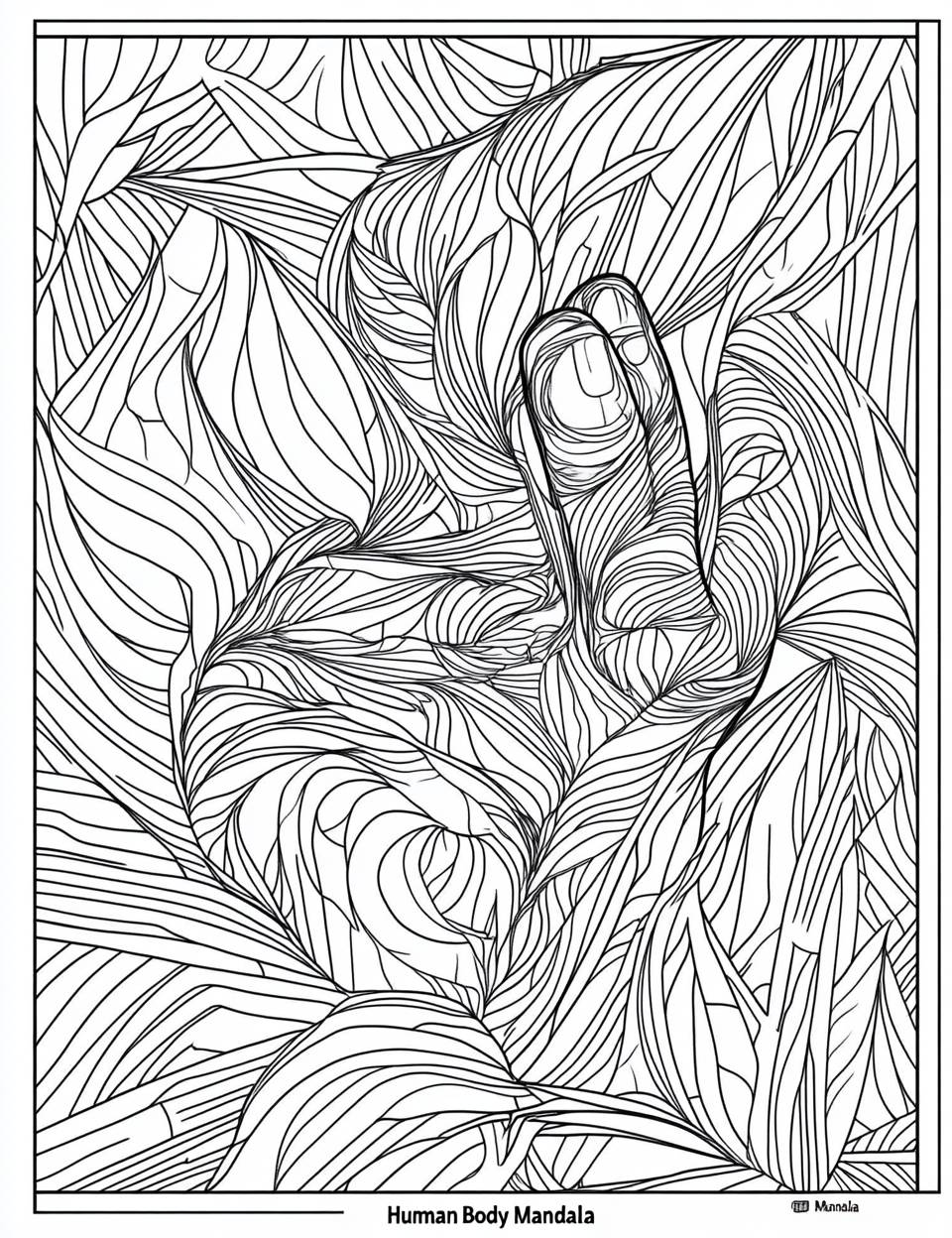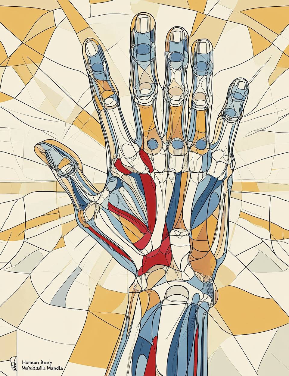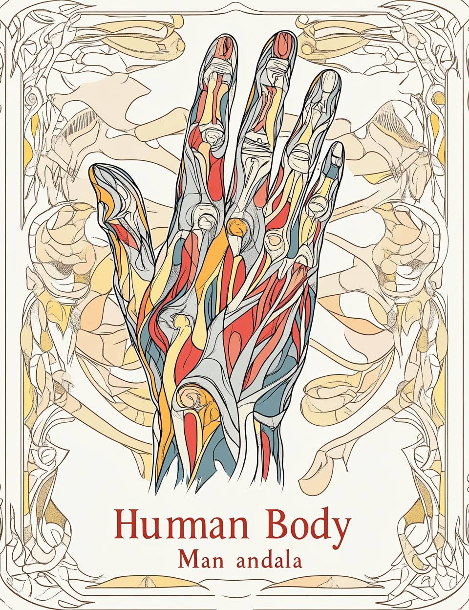 Cubism design of a human hand on the cover titled 'Human Body Mandala'.