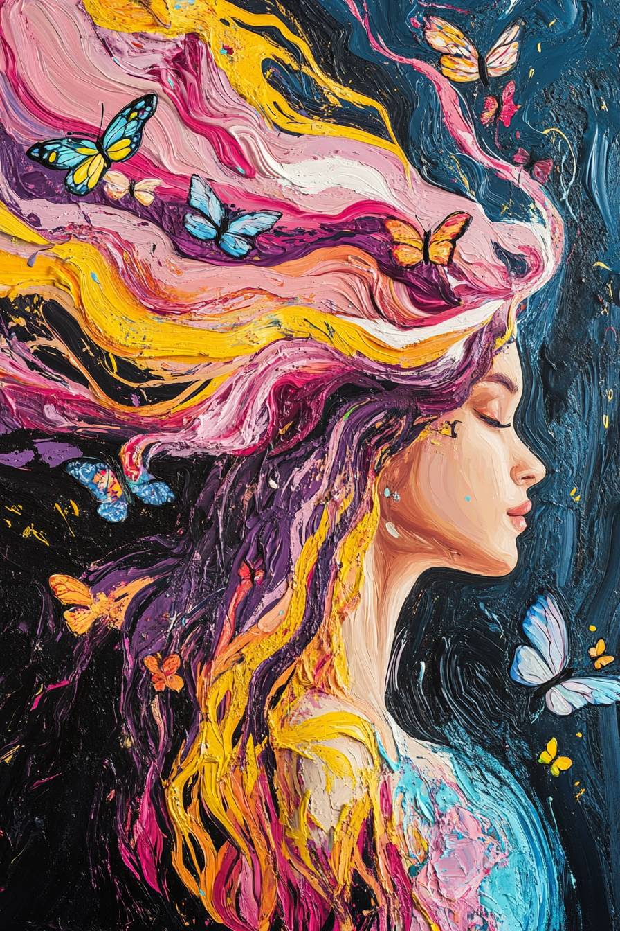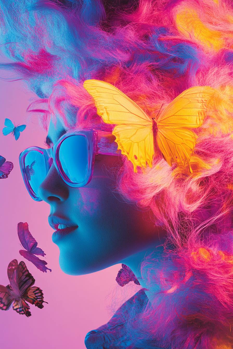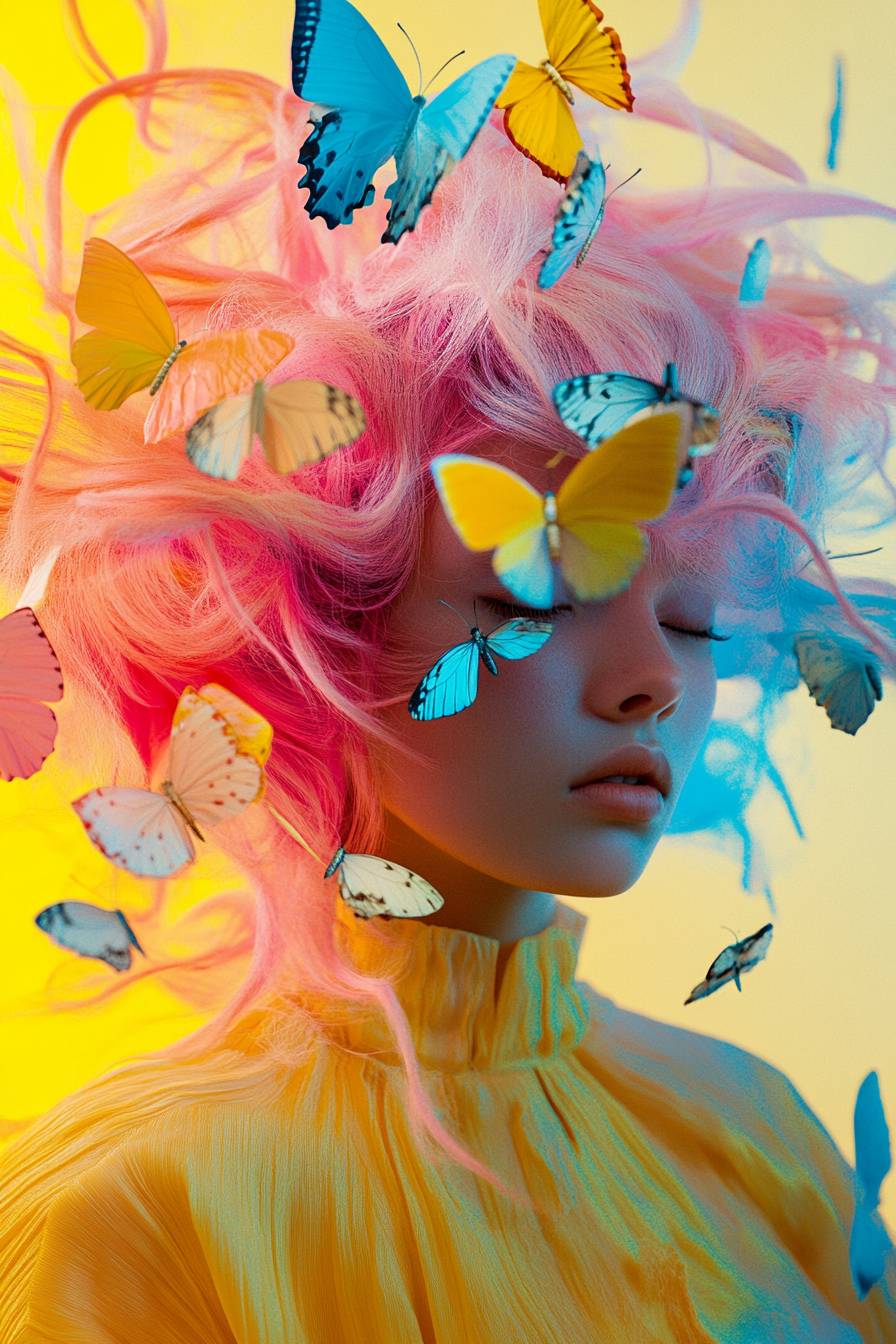 masterpiece, ultra detail, 8k, Depict a vibrant and dynamic portrait of a girl with hair that transitions into a fiery cascade of colors, mimicking the hues of a sunset. Her hair is a mix of pink, yellow, and blue, swirling around her in a visually striking display, accompanied by delicate butterflies. The image conveys a sense of freedom and the beauty of transformation. --v 6.1 --ar 2:3