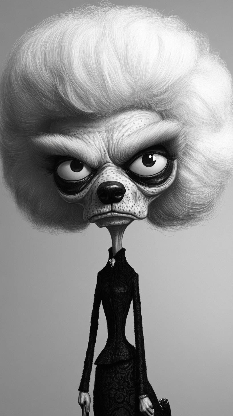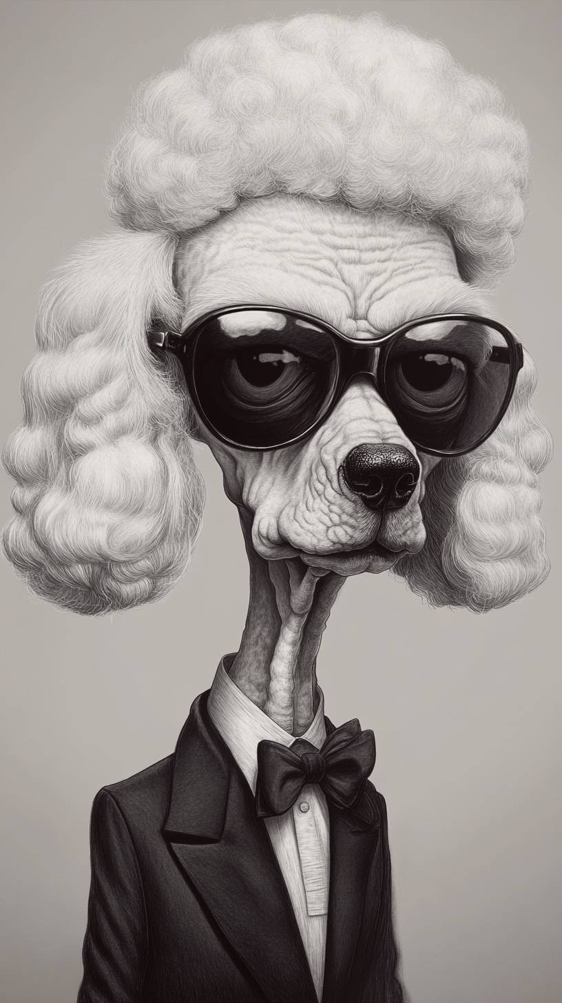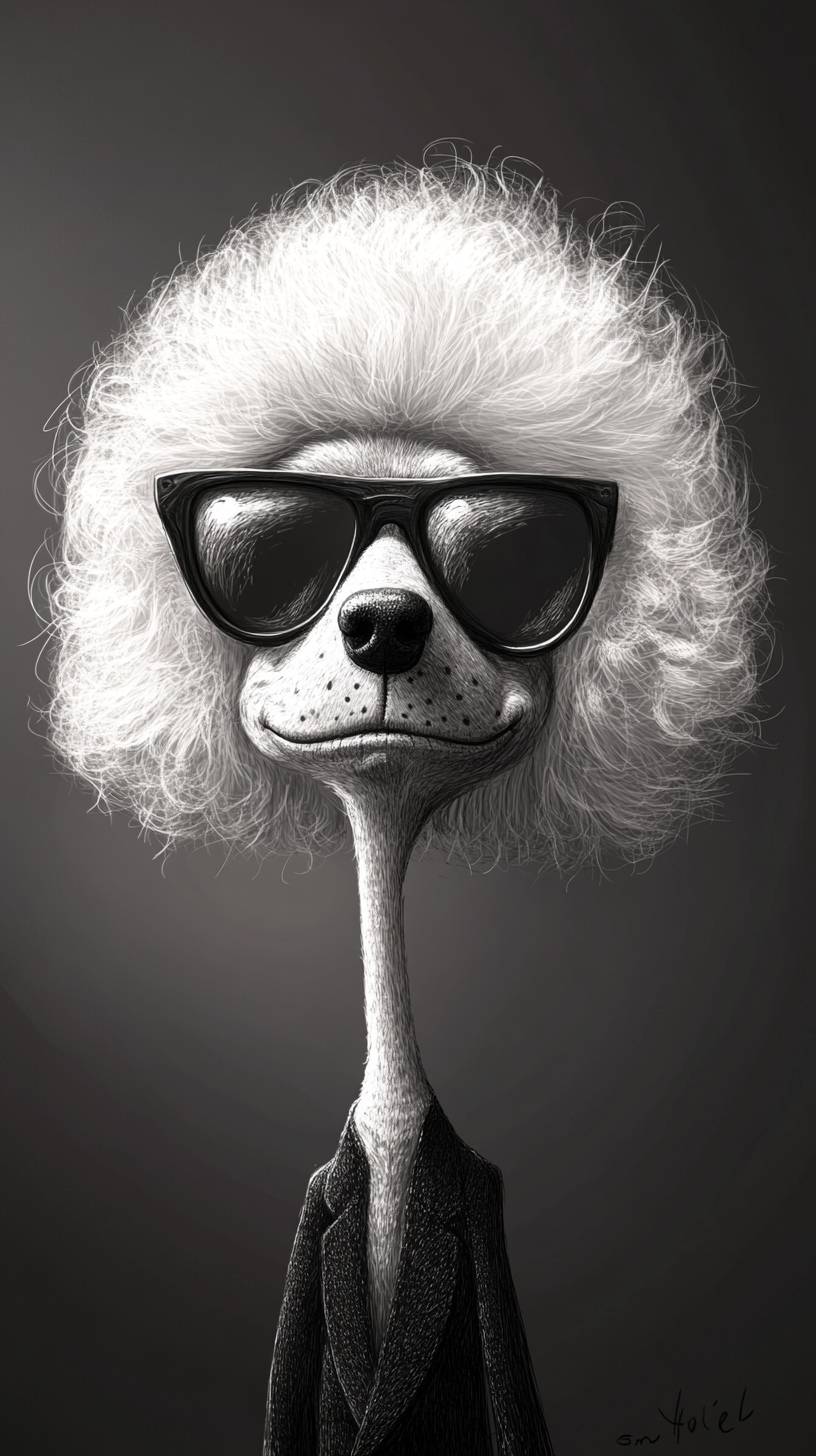create a hybrid creature of karl lagerfeld and a poodle dog, with an oversized head, highly expressive eyebrows, and a mischievous grin. The illustration should be in the style of Tiago Hoisel, using the medium of crayons, and portraying the celebrity engaging in their most iconic activity or pose. Pay attention to capturing the essence of their unique personality and quirks, while emphasizing exaggerated features such as their hair, fashion style, or accessories. The setting should be a plain background. Capture a sense of humor and lightheartedness in this caricature that showcases the celebrity in an amusing and memorable way. --ar 9:16 --v 6.1