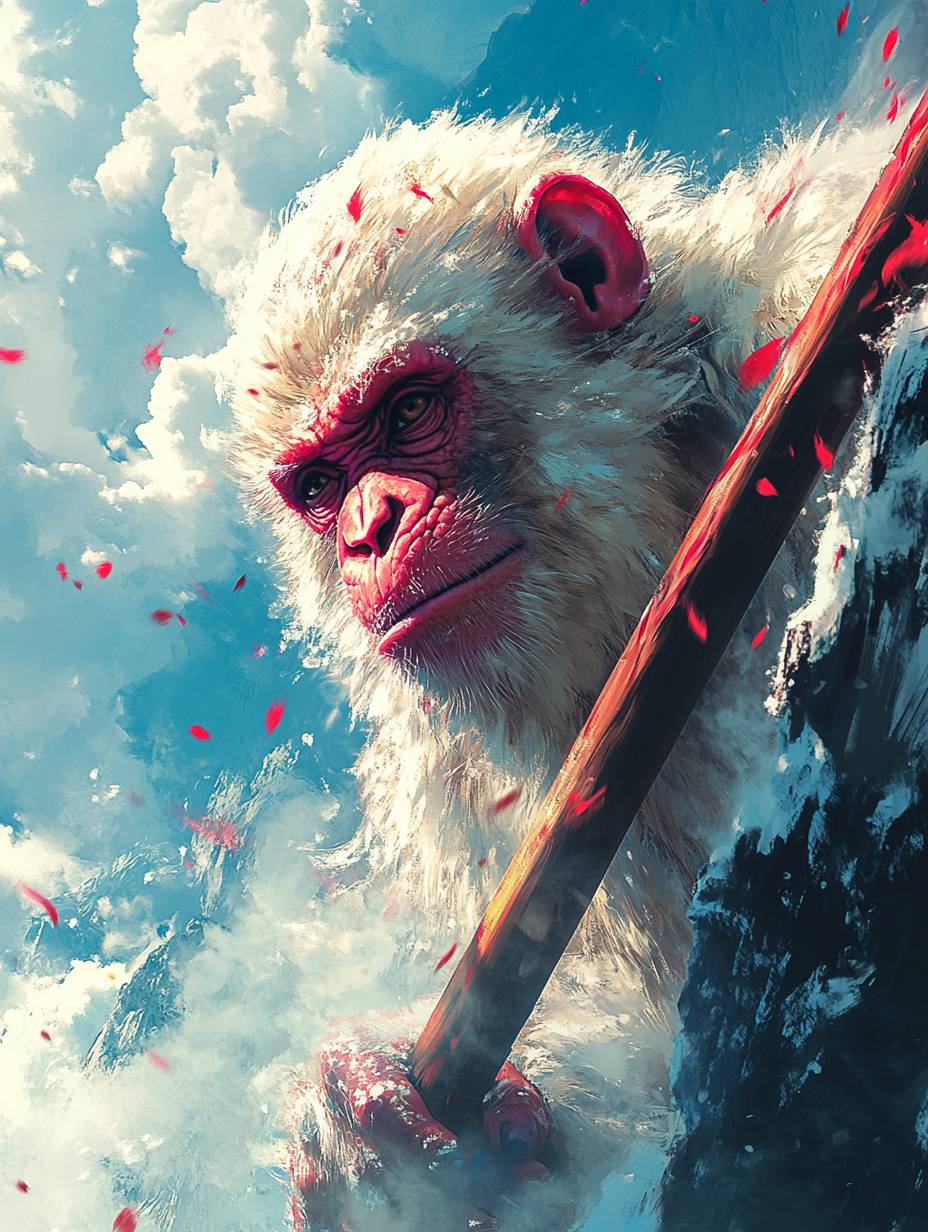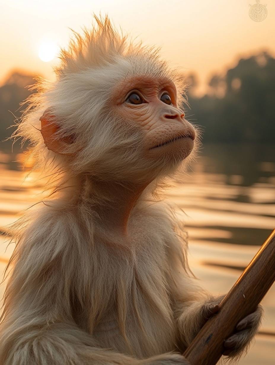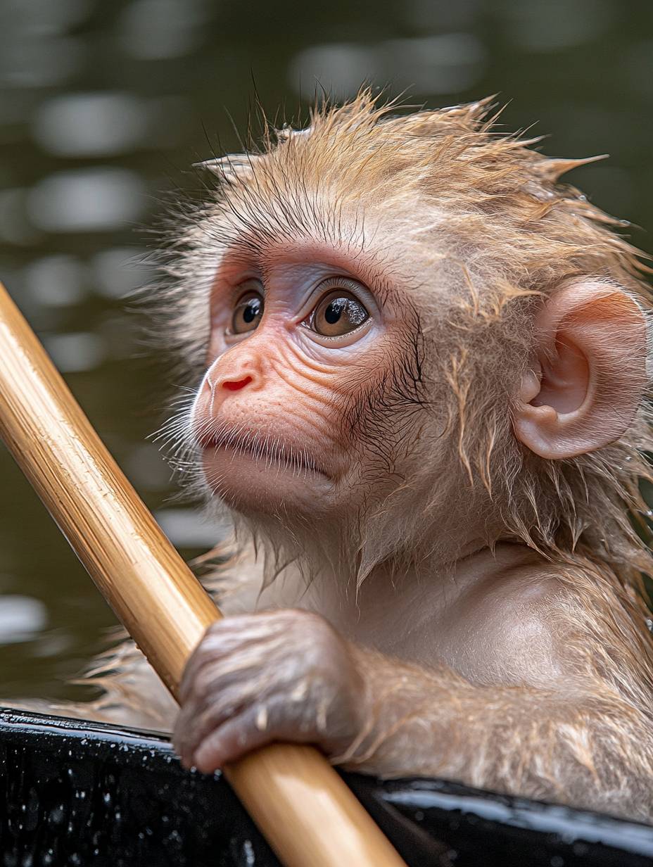 The monkey's fur is covered with white cotton, and its face has red cheeks like human children. It stands on the bank of West Lake in Hangzhou, holding an oar in one hand and looking at the water surface in profile. The sunlight shines through the clouds onto its body, creating a soft light effect that highlights the color contrast between brown hair and pink skin. Its eyes sparkle as it looks into the distance, adding depth to the scene. --chaos 50 --ar 3:4 --stylize 750 --v 6.1