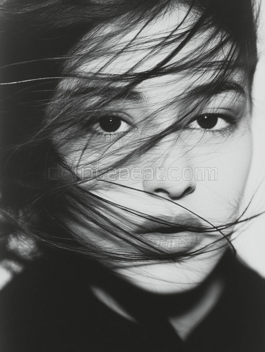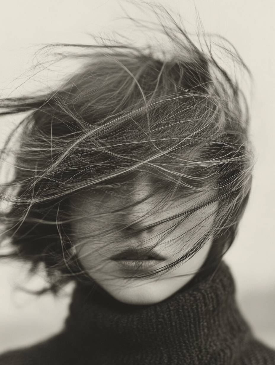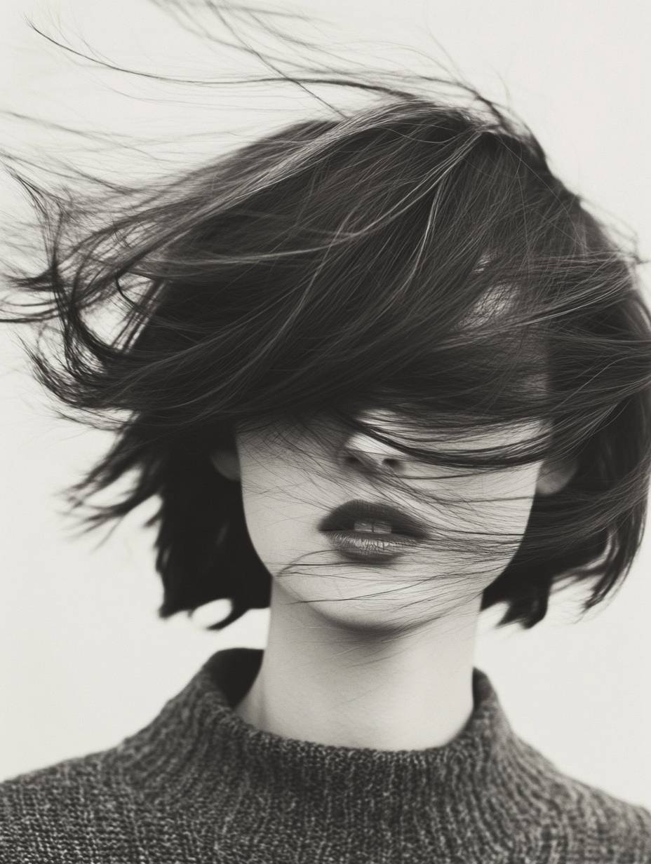 A striking black-and-white portrait of a young woman with windswept hair obscuring her face. The strands of hair are wild and flowing, creating intricate patterns and texture, with a sense of movement and mystery. Her expression is hidden, with only her lips partially visible, adding a surreal, enigmatic quality to the image. The background is softly blurred, making her figure stand out in sharp focus, while the monochromatic tones enhance the contrast and moodiness of the scene. Detailed textures, high contrast, evocative of vintage film photography with a haunting, ethereal feel. --ar 3:4 --style raw --personalize kpgfhje --v 6.1