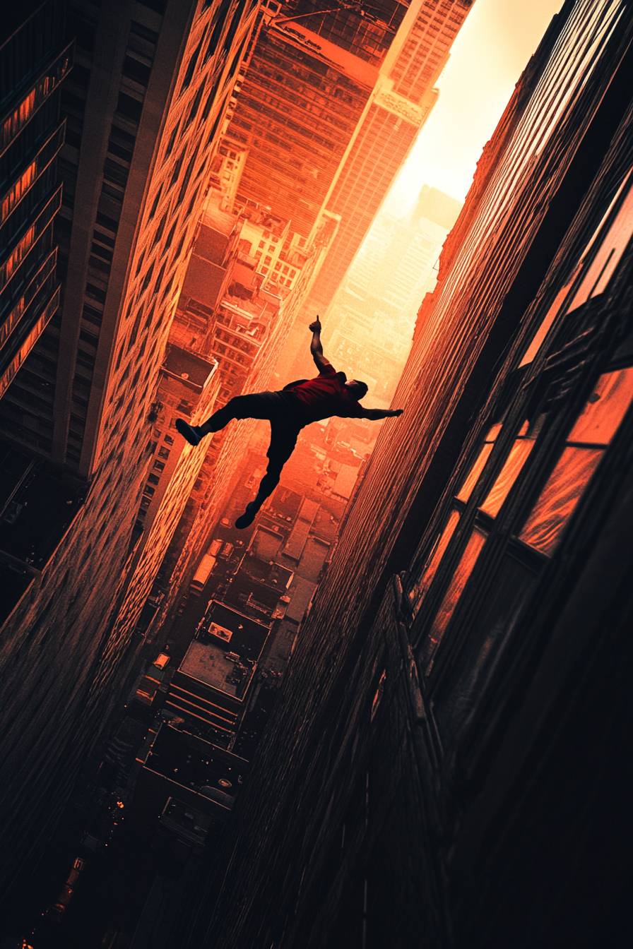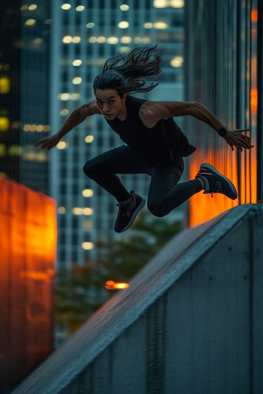 [SUBJECT] portrayed in High-Speed Urban Parkour, leaping between buildings and scaling walls. Use gritty [COLOR1] and vibrant [COLOR2] to capture the urban action --v 6.1 --ar 2:3