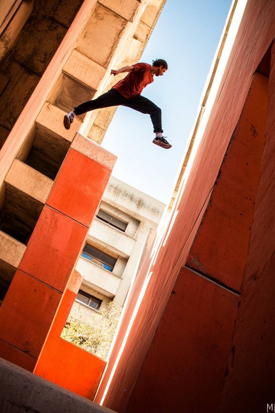 [SUBJECT] portrayed in High-Speed Urban Parkour, leaping between buildings and scaling walls. Use gritty [COLOR1] and vibrant [COLOR2] to capture the urban action.