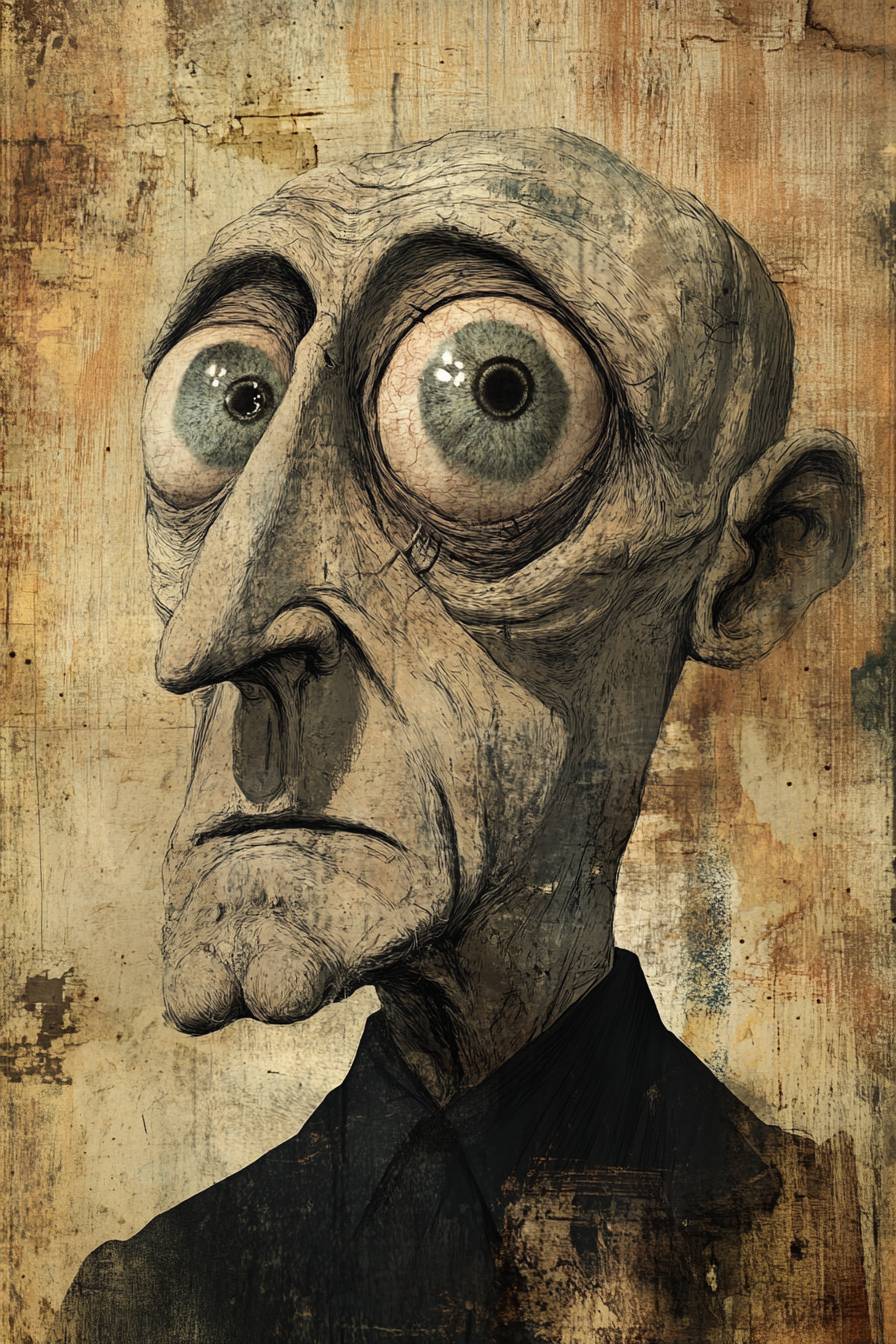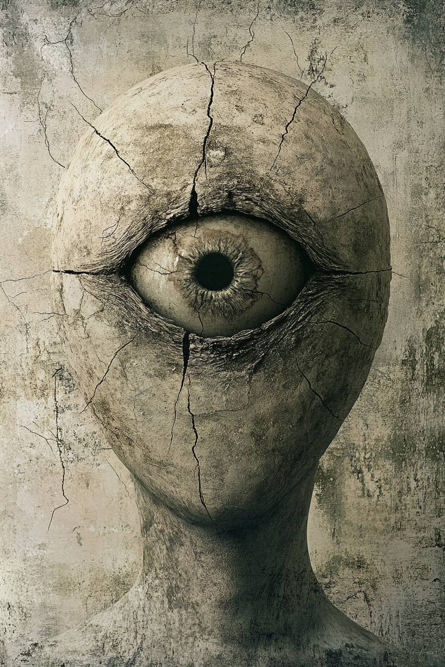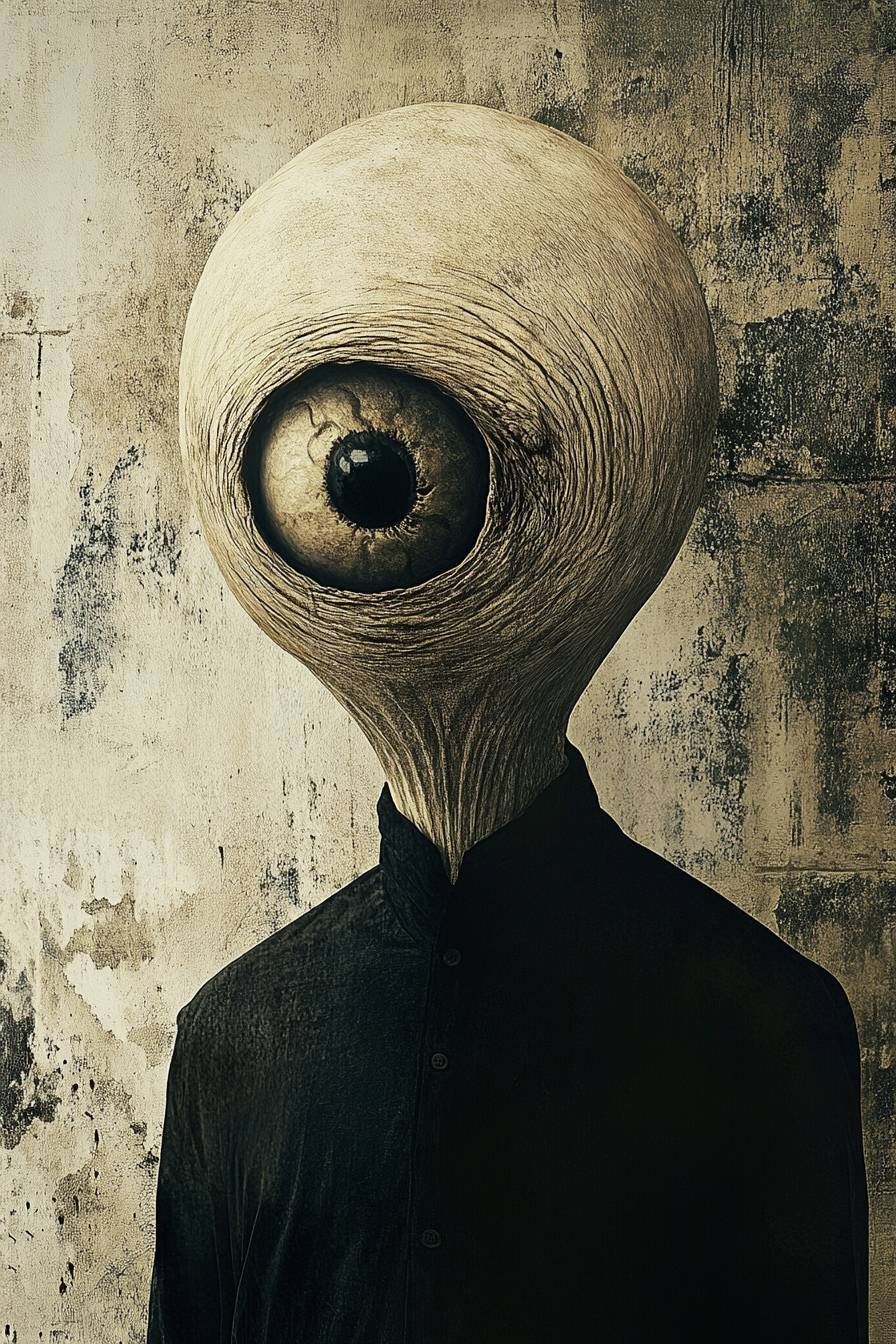Surreal grunge art illustration. The strange pale, enormous-headed [SUBJECT] has one enormous hideous eye and his/her forehead is very wrinkled convex. He/she [LOCATION] --ar 2:3 --v 6.1