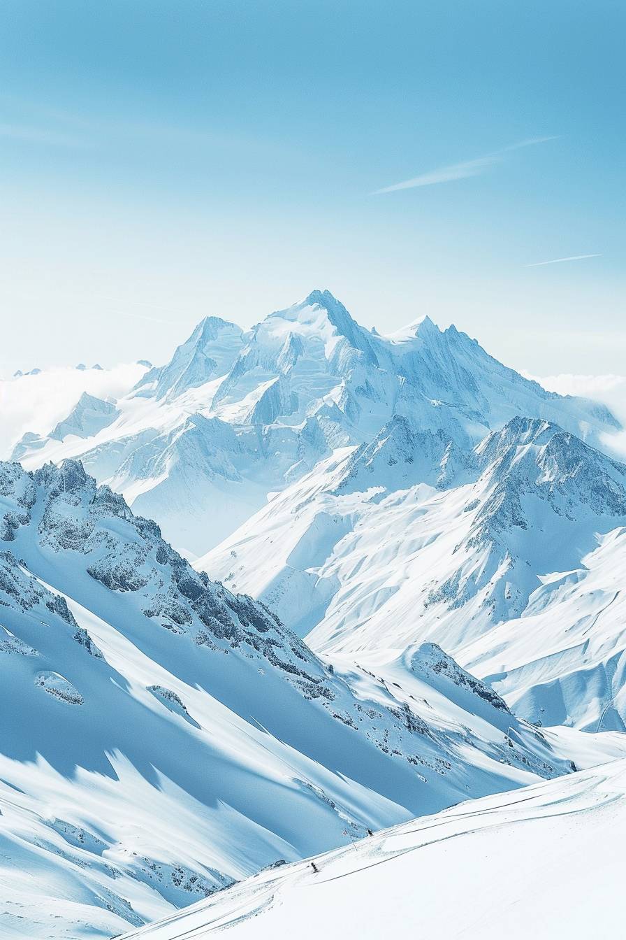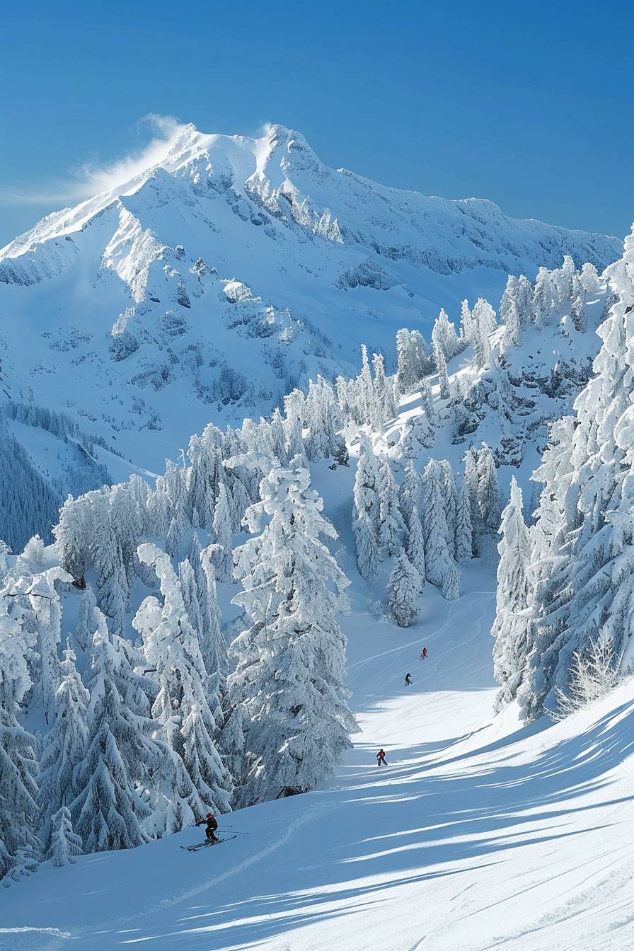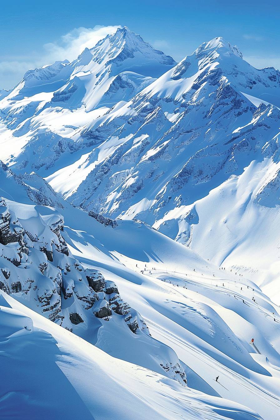 A majestic mountain range covered in a blanket of snow, with clear blue skies and a crisp air that invigorates the senses, as skiers glide down the slopes with grace.-sref 654728319 --ar 2:3 --v 6.0