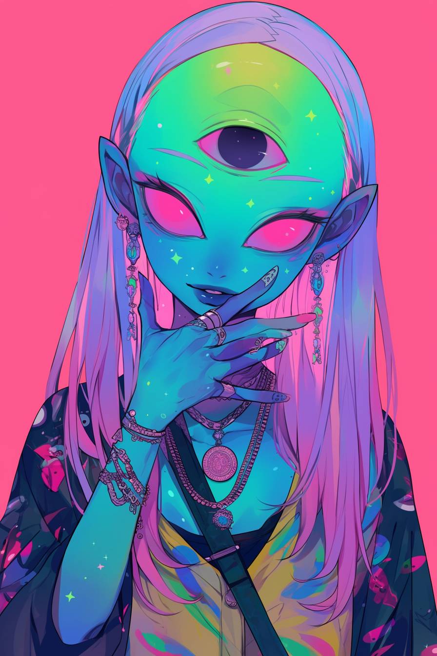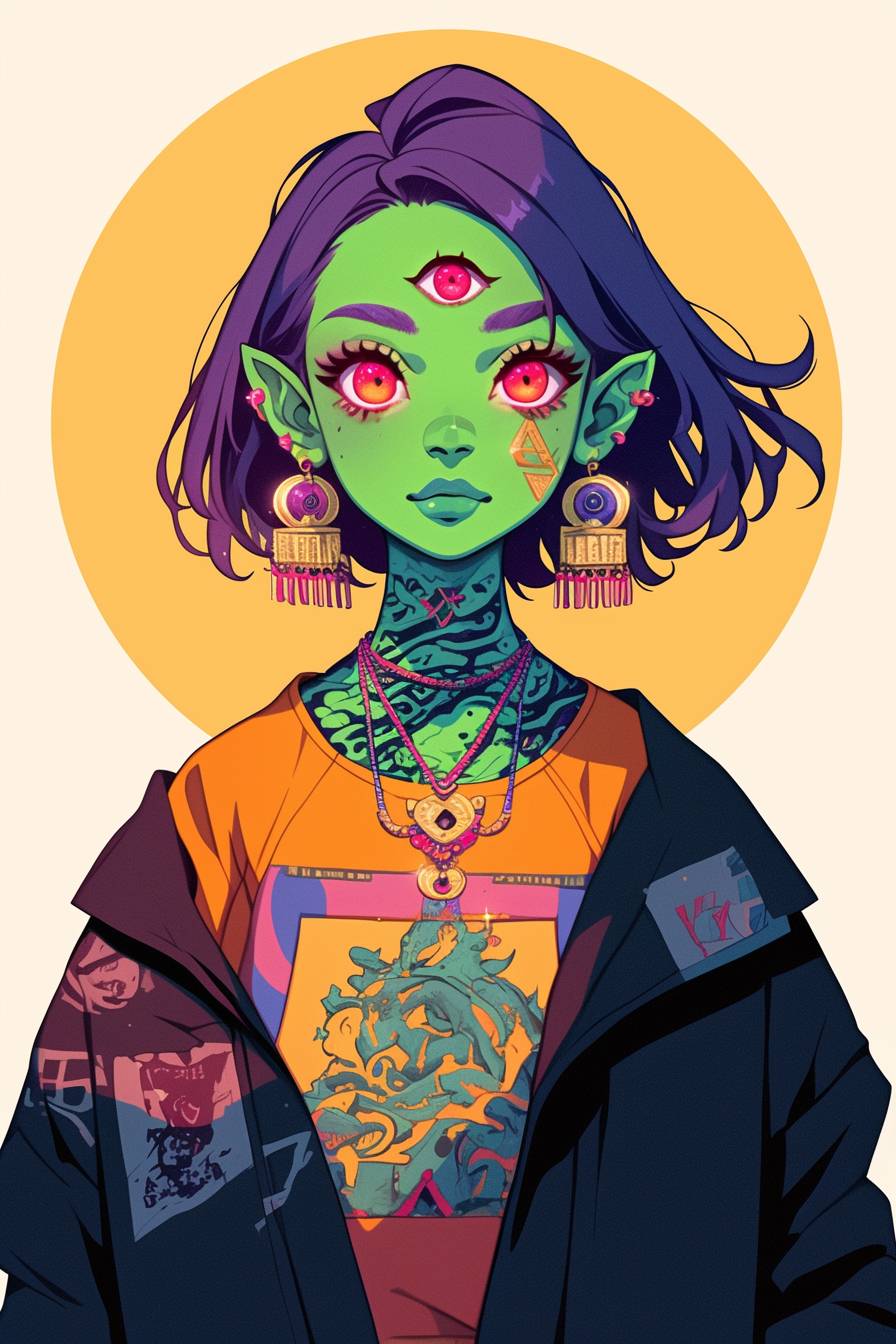 alien, third-eye, tattooed, smirky smile, jewelry, thug stance, streetwear style, iridescent, trippy spiritual vibe, plain background, creepy cute --ar 2:3 --niji 6