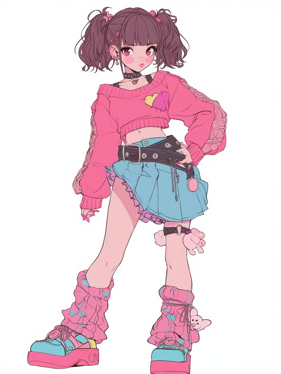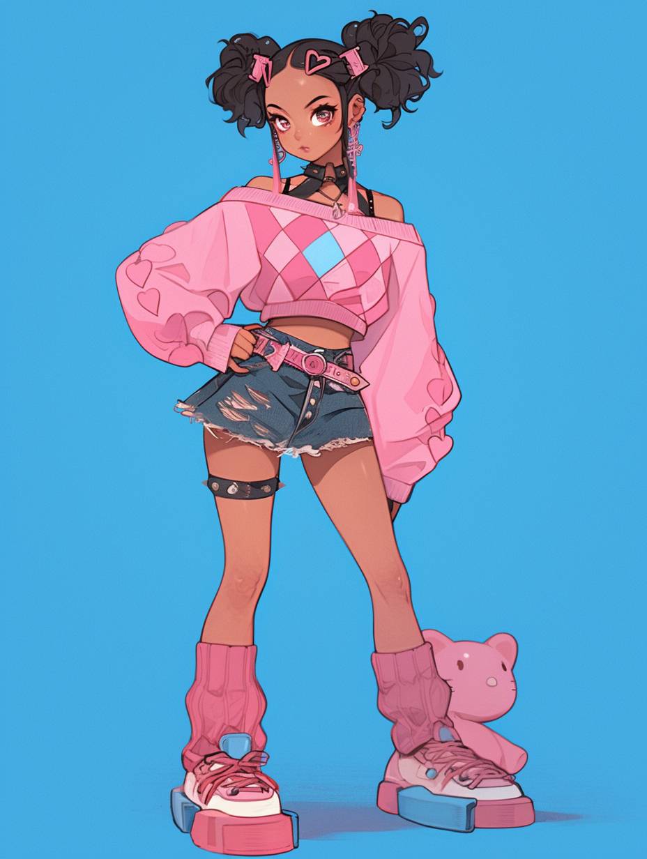 A 2D Japanese anime-style character with a playful Y2K-inspired look, featuring a mix of cute and edgy elements. She wears a cropped, pink argyle sweater with lace-up details in the front, paired with a layered denim mini skirt that gives a ruffled effect. Her accessories include a bold pink belt with a statement buckle, hair clips holding up messy, loose buns, and a black choker for an added edgy touch. She holds a plush toy, adding a playful, nostalgic element. Her legs are partially wrapped in oversized, baggy jeans that hang low, exposing her colorful platform sneakers. Her expression is fun and sassy, with a slight pout, capturing the Y2K aesthetic’s blend of sweetness and attitude. The color palette emphasizes pastel pinks, blues, and denim textures, giving her a retro yet modern look in a classic anime style.