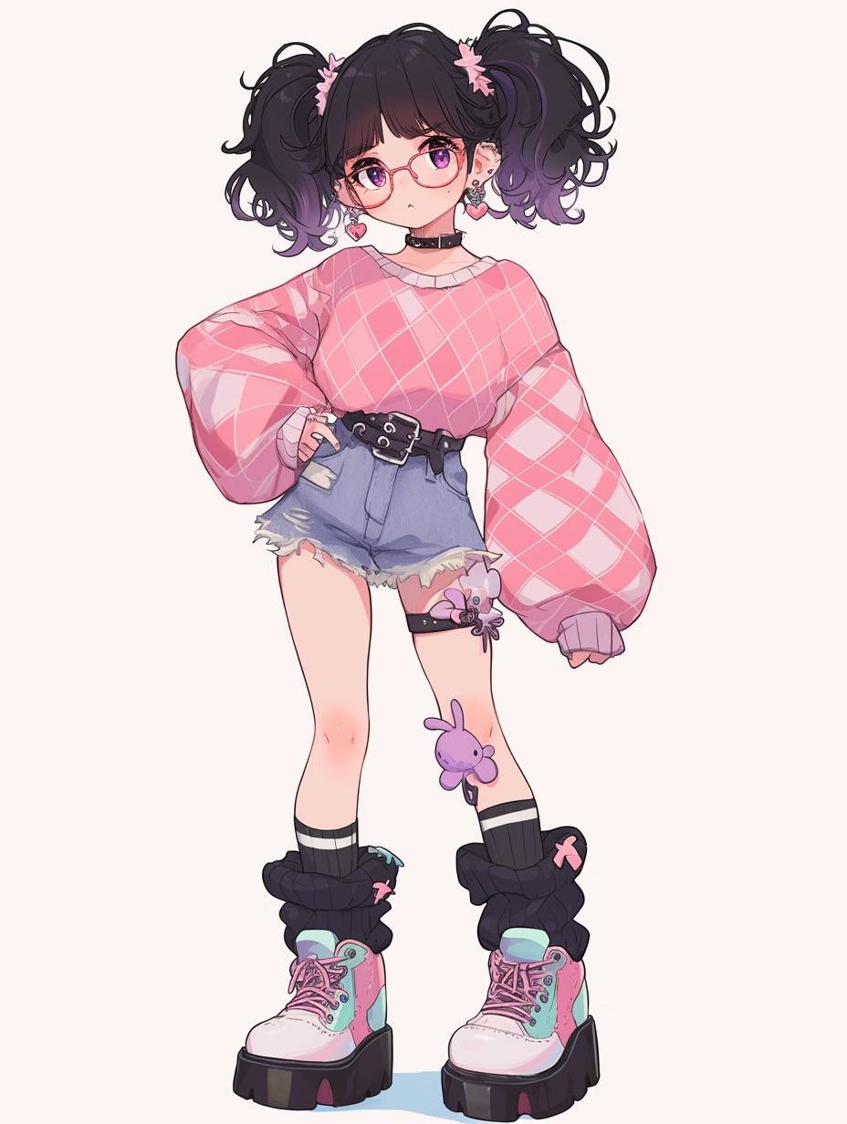 A 2D Japanese anime-style character with a playful Y2K-inspired look, featuring a mix of cute and edgy elements. She wears a cropped, pink argyle sweater with lace-up details in the front, paired with a layered denim mini skirt that gives a ruffled effect. Her accessories include a bold pink belt with a statement buckle, hair clips holding up messy, loose buns, and a black choker for an added edgy touch. She holds a plush toy, adding a playful, nostalgic element. Her legs are partially wrapped in oversized, baggy jeans that hang low, exposing her colorful platform sneakers. Her expression is fun and sassy, with a slight pout, capturing the Y2K aesthetic’s blend of sweetness and attitude. The color palette emphasizes pastel pinks, blues, and denim textures, giving her a retro yet modern look in a classic anime style. --ar 3:4 --niji 6